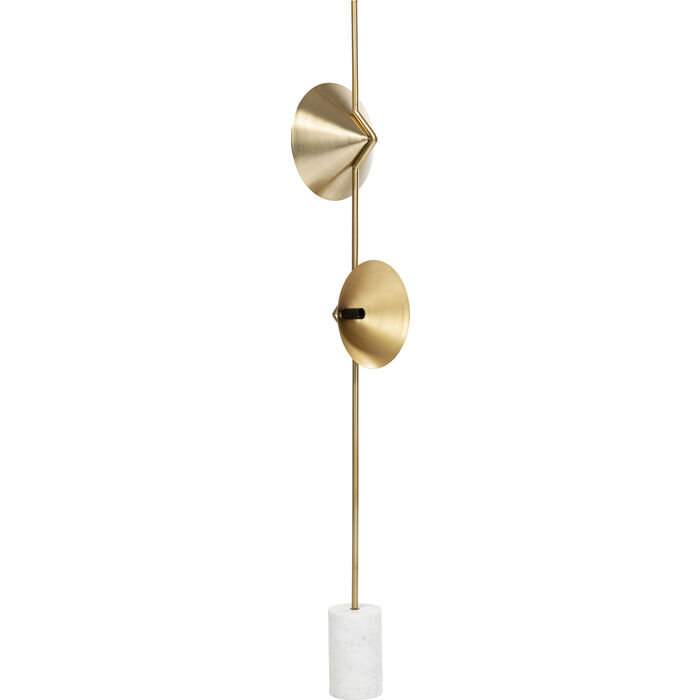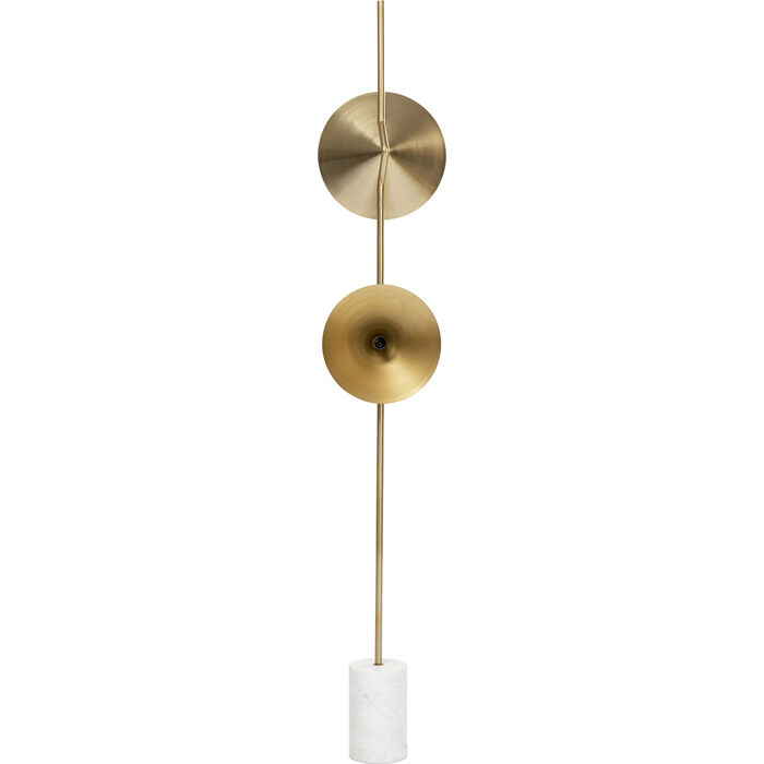 En eye-catcher med marmorfot i vitt och lampskärmar av guldfärgat stål.