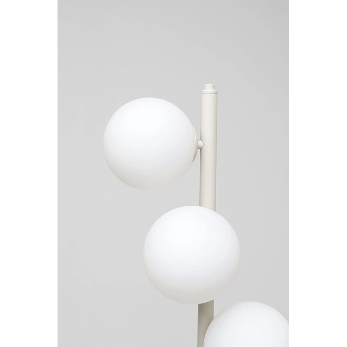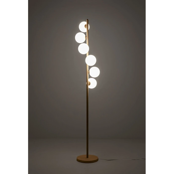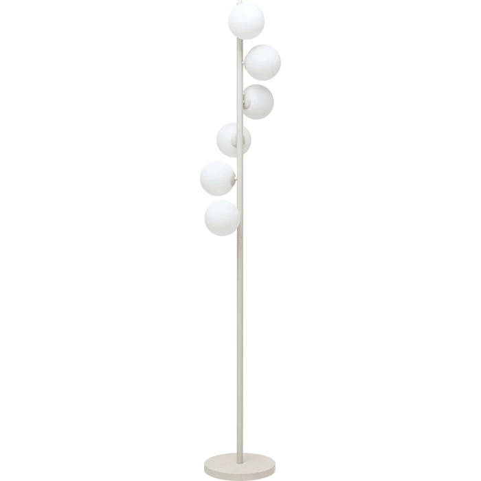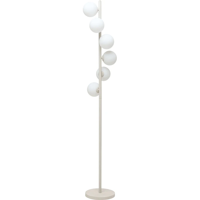 En elegant golvlampa med slank siluett där sex mjölkiga glaskupor svävar kring en smäcker stålstomme. Den greige ytan ger ett mjukt, modernt uttryck och gör lampan enkel att kombinera med många färgskalor. Finns i flera färger och versioner.