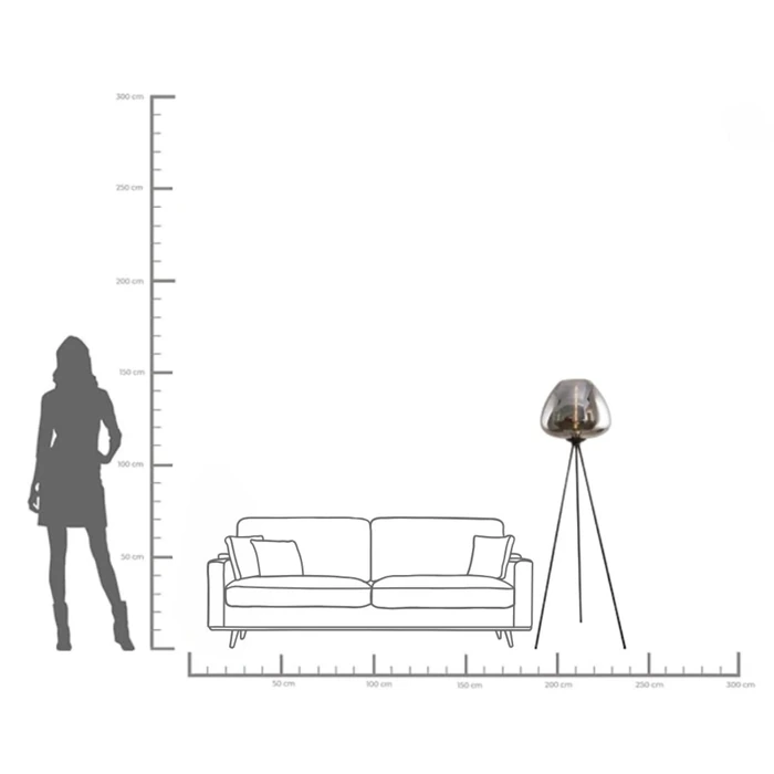 En elegant golvlampa som kombinerar tonat glas med ett nätt metallstativ. Placera den vid soffan eller i läshörnan för att få ett mjukt, behagligt sken och en tydlig designaccent.