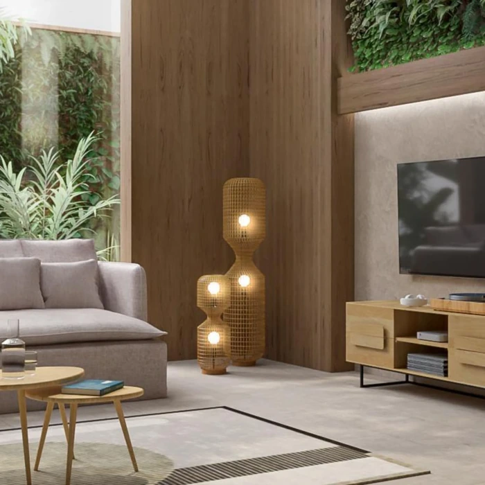 Kompakt golvlampa i naturrotting som sprider varmt, mjukt ljus och ger rummet en rofylld, organisk känsla.