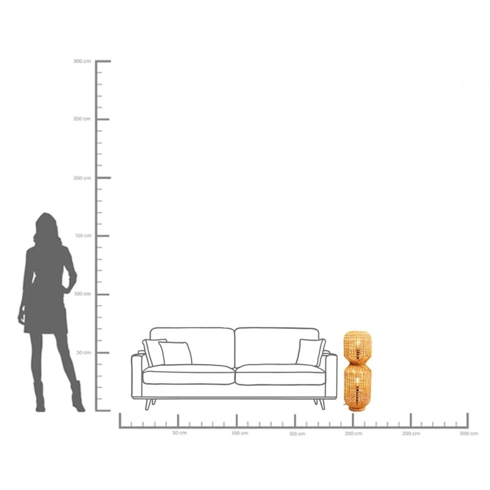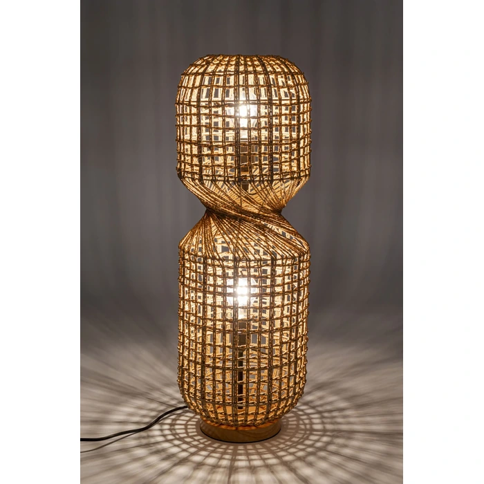 Golvlampa i naturrotting som skapar ett behagligt, stämningsfullt sken. Den handflätade skärmen ger vackra ljusspel och ett naturligt uttryck som passar lika bra i vardagsrum som i hall eller sovrum.