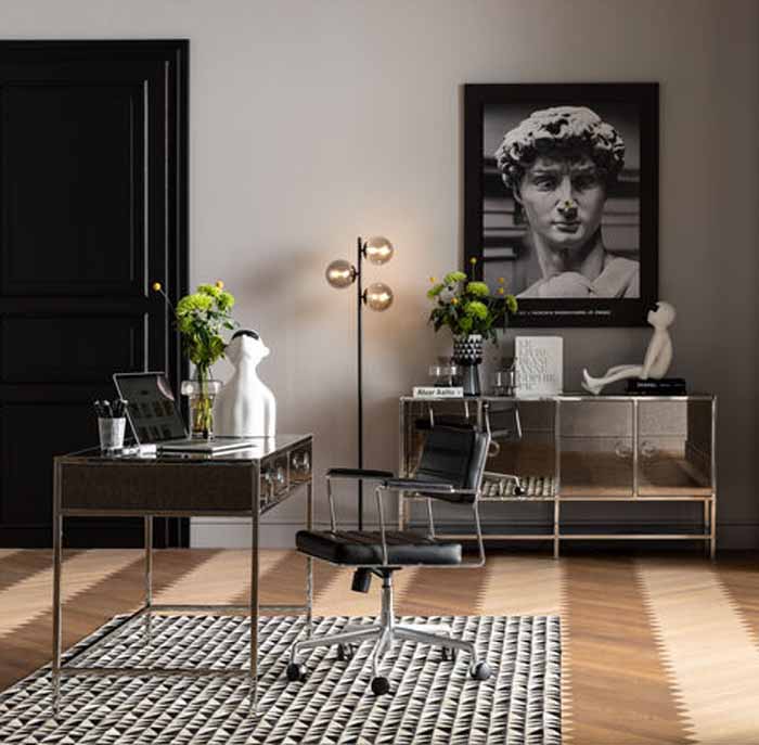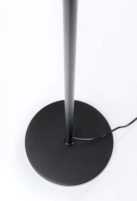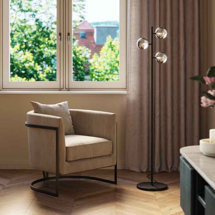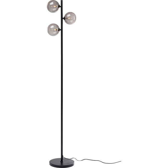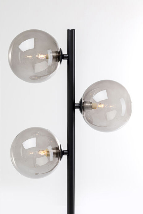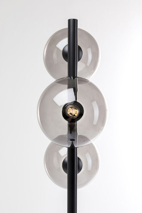 En riktigt snygg och stramt elegant golvlampa i svart lackat stål och tre glasklot i svagt gråtonad nyans. Lampan är både minimalistisk i stilen men också en showpiece då den är ett blickfång till rummet. Golvlampan finns även i guldfinish med lätt guldtonade glas.