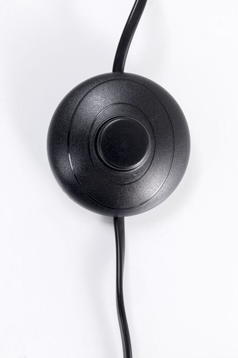 Material: lampfot i svart pulverlackat stål, lampskärmar i tonat glas samt plastbeklädd sladd med golvströmbrytare.