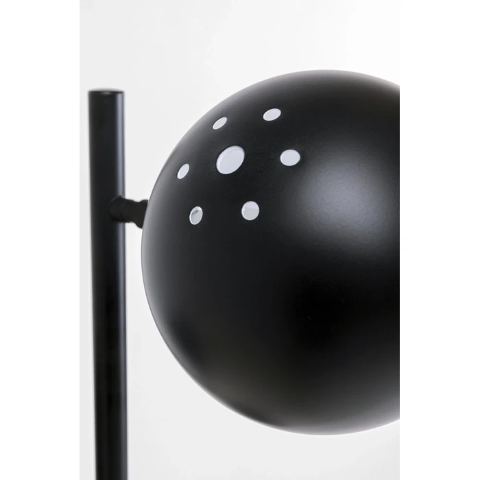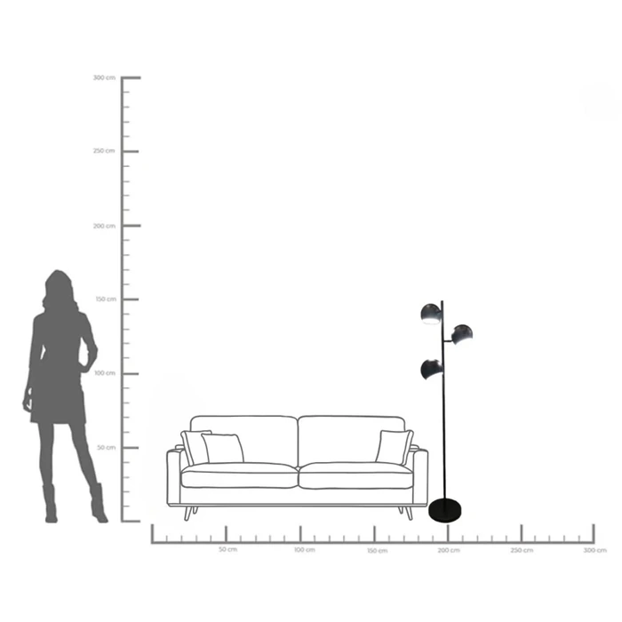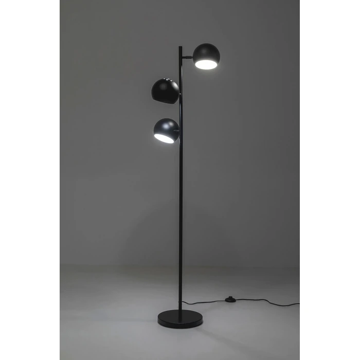Golvlampa Trio ger ett modernt uttryck med tre halvklotformade skärmar som kan vinklas för att styra ljuset. Den kompakta foten gör den lätt att placera intill soffa eller fåtölj, medan den mattsvarta ytan smälter in i många stilar. Finns även i krom med 3 eller 5 lampskärmar.