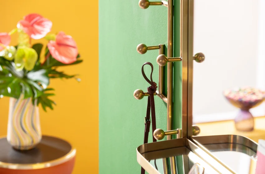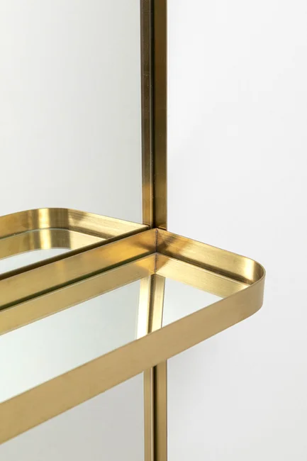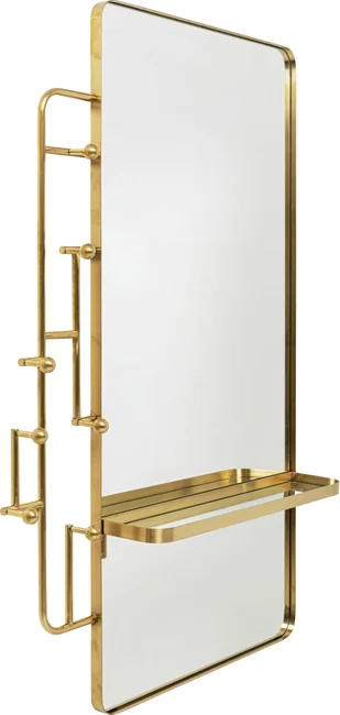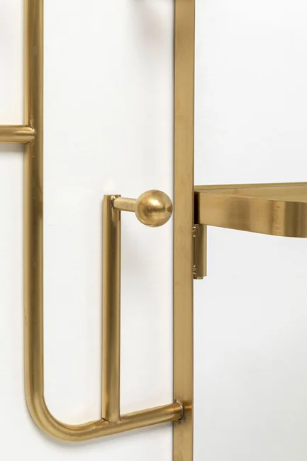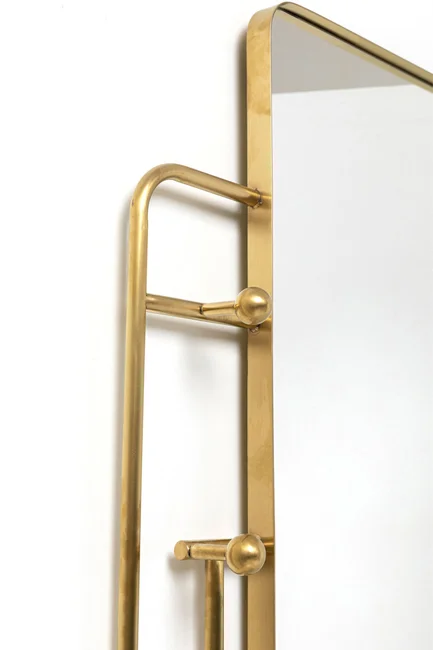 Denna snygga vägghängda klädhängare är den perfekta lösningen för alla som letar efter en elegant och praktisk lösning för att hänga upp kläder. Stålramen är utförd i mässing och monteras på väggen. Klädhängaren har en stor spegel med hylla och flera väggmonterade krokar. Oavsett om det är i hallen, sovrummet, din walk-in closet eller i gästrummet ger denna garderobskombination en känsla av elegans. Ta en sista titt i spegeln för att kolla din outfit och ta sedan av din jacka från en av krokarna - med denna klädhängare börjar varje dag med stil!