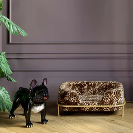 Säng för hund eller katt med lejontryck och ram av metall i guld.