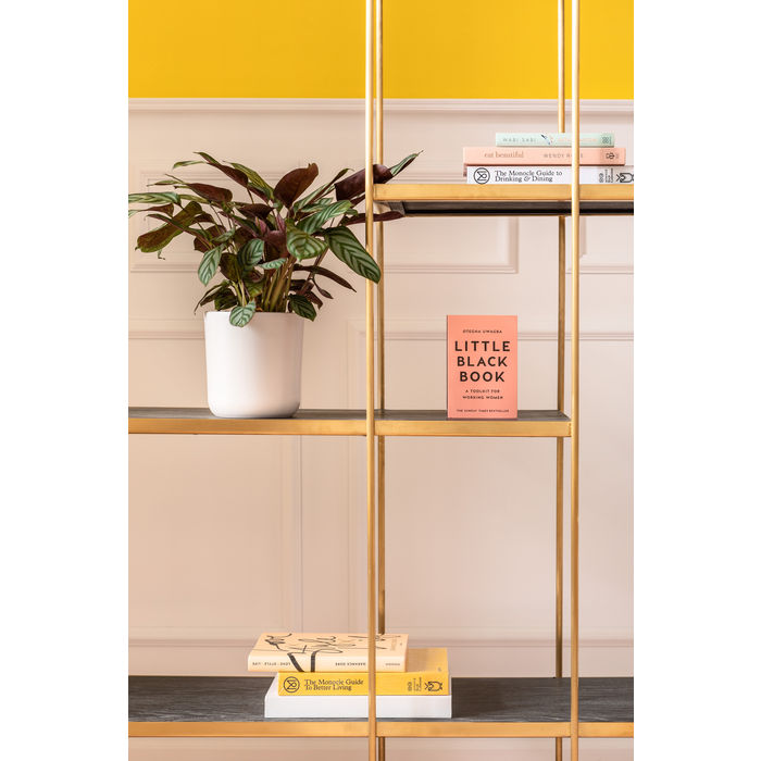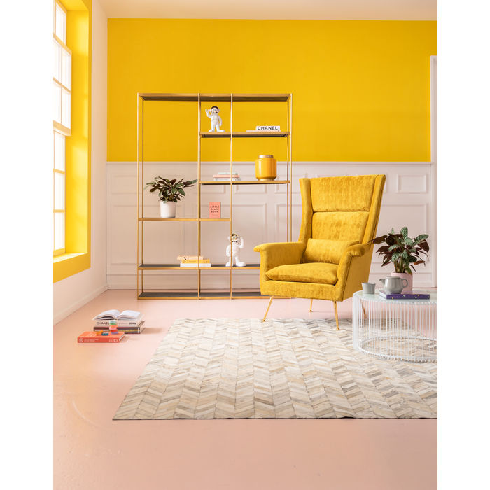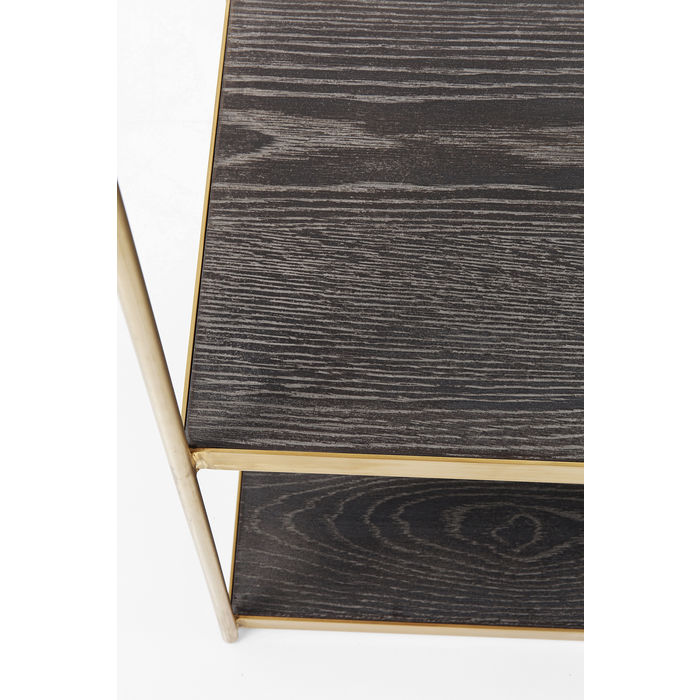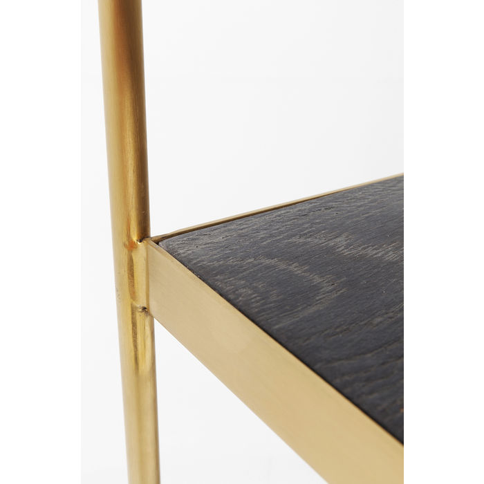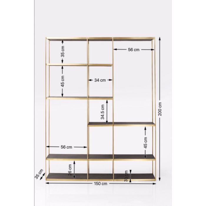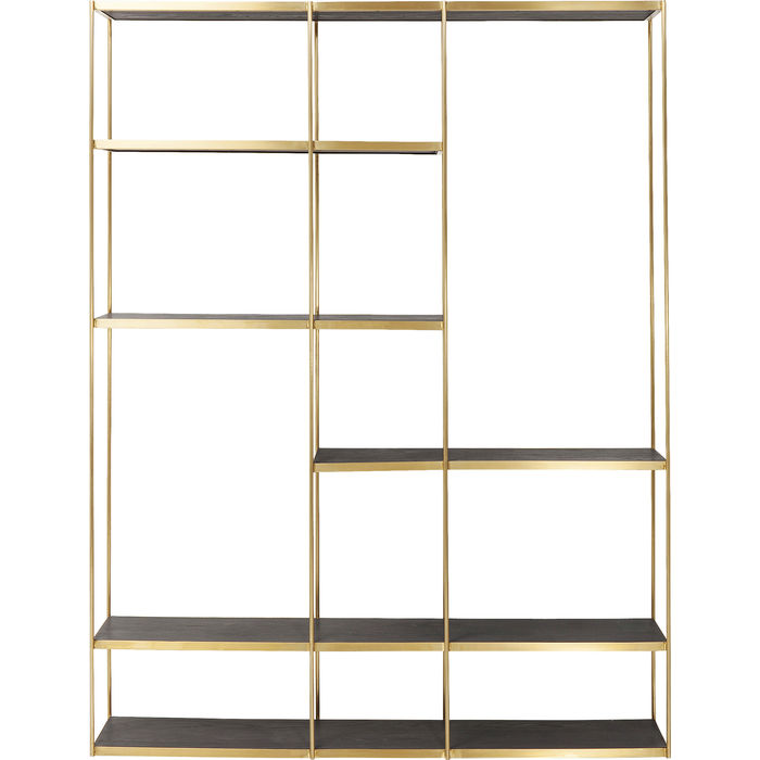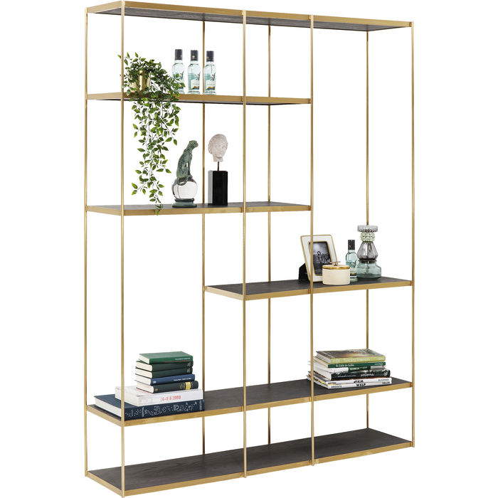 En stor hylla i stilrent utförande med öppna hyllplan i asymmetrisk indelning som vackert exponerar dina inredningsdetaljer, böcker och magasin. Hyllan har en stram och elegant design med ram i mässing och hyllplan i massiv mörk betsad och vaxad ek. Fästen för förankring i vägg medföljer.