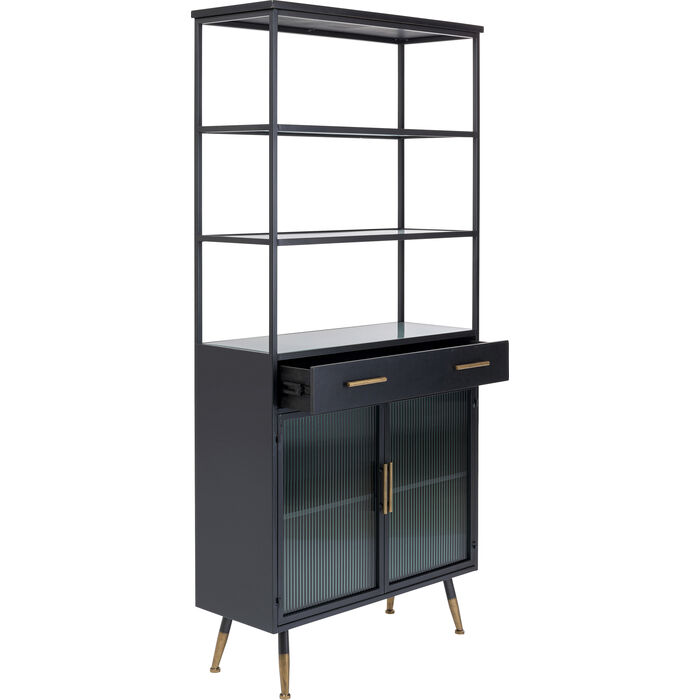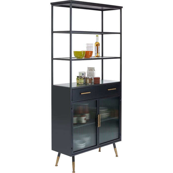 Denna praktiska och eleganta bokhylla anpassar sig till alla miljöer, vare sig det är i köket, badrummet, arbetsrummet eller vardagsrummet. Hyllan är en sann förvaringstillgång: två fack bakom de två glasdörrarna, en låda och tre extra hyllor ger tillräckligt med utrymme för dina favoritprylar. De lätt utsvängda benen av kraftigt, belagt stål skapar stabilitet.