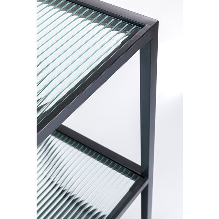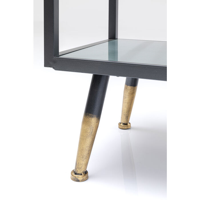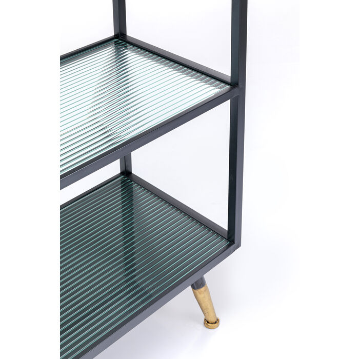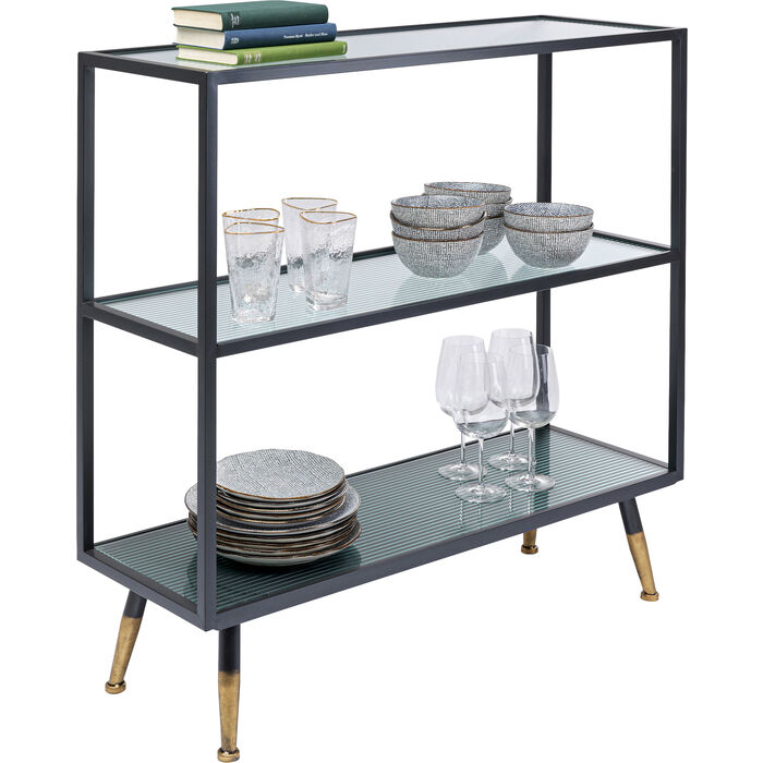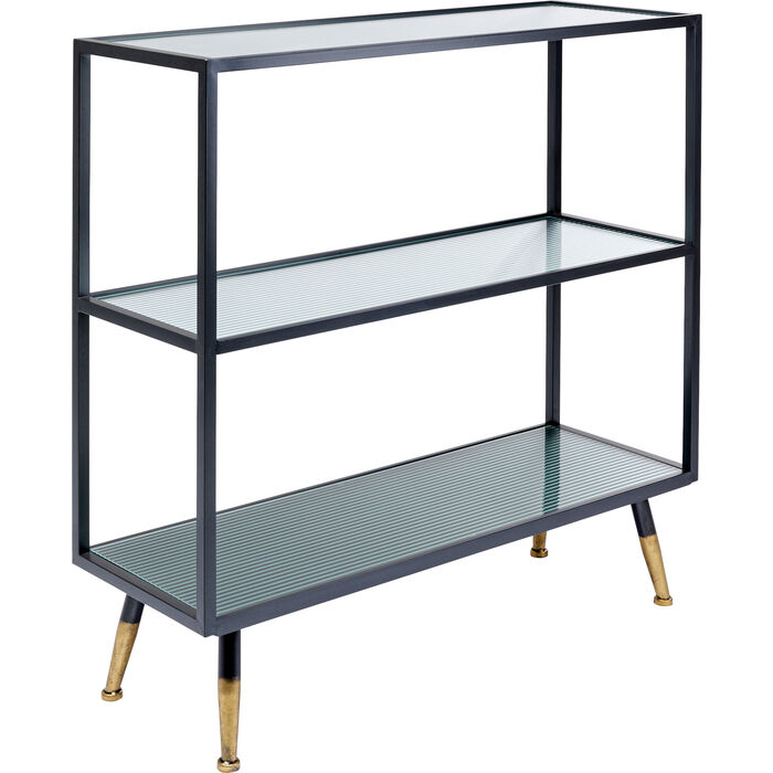 Denna golvstående bokhylla med metallram är ren och enkel, medan glashyllorna utstrålar en vass känsla med elegans som bryts upp av fötterna i vintage-look. Enhetens tre hyllplan är permanent installerade och tillverkade av högkvalitativt, härdat säkerhetsglas. Detta ger metallhyllan en hög nivå av stabilitet och robusthet. Det är därför inte bara en perfekt plats för prydnadsföremål utan även för böcker, och passar smidigt in i vardagsrummet såväl som i sovrummet eller hemmakontoret.