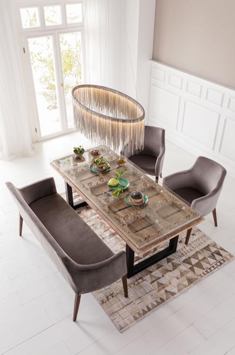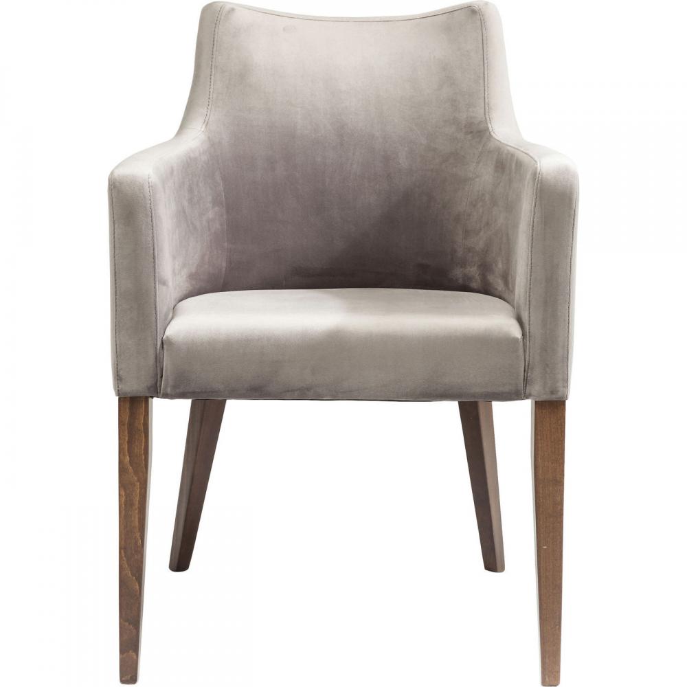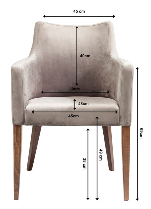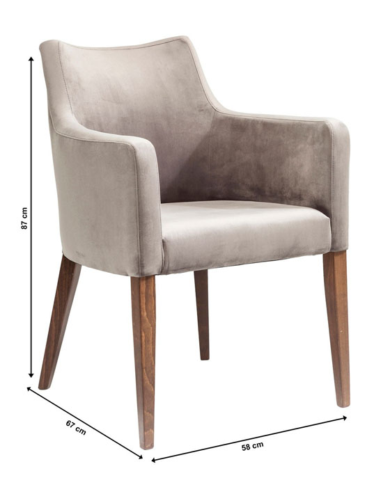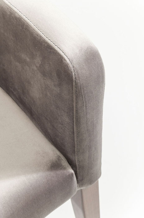 En klassisk klädd matstol med klädsel i sammet och ett modernt snitt i sober grå nyans och ben i en varmbrun bets. Finns även i en petrol-blå nyans. Stolen har en mycket bekväm komfort med stadig sits, lagom lutning i rygg samt klädda armstöd. Kombinera fint med Stol Vince i samma serie och tyg. Vi skickar gärna tygprov.