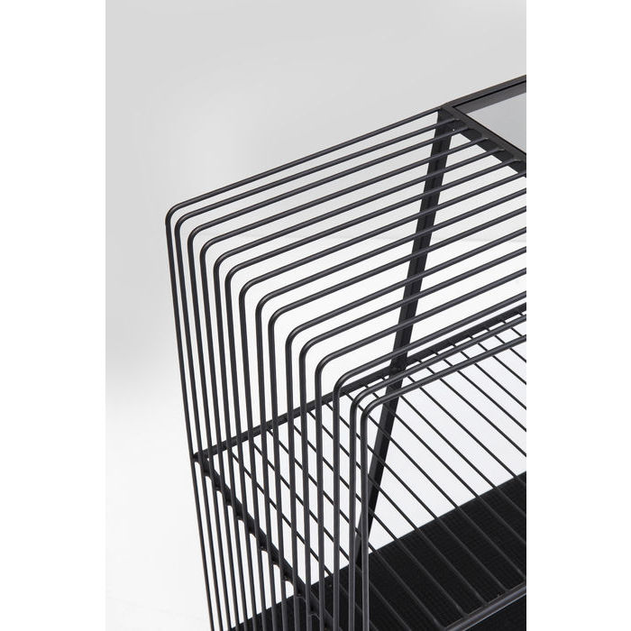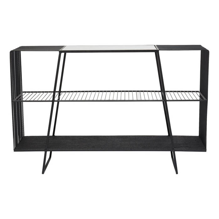 Ett stilrent konsolbord som även fungerar som hylla. Den grafiska ramen i svart stål kombineras med en topp i färgat säkerhetsglas för ett modernt uttryck som passar hall, vardagsrum och matsal.