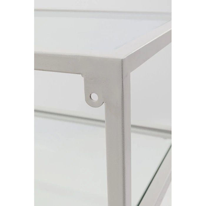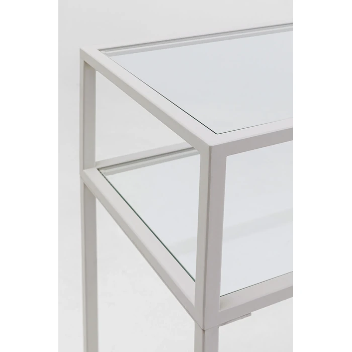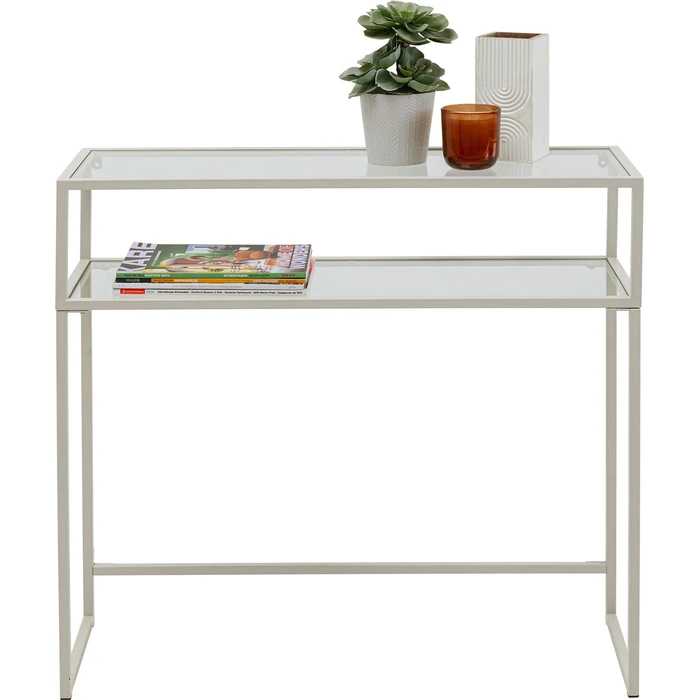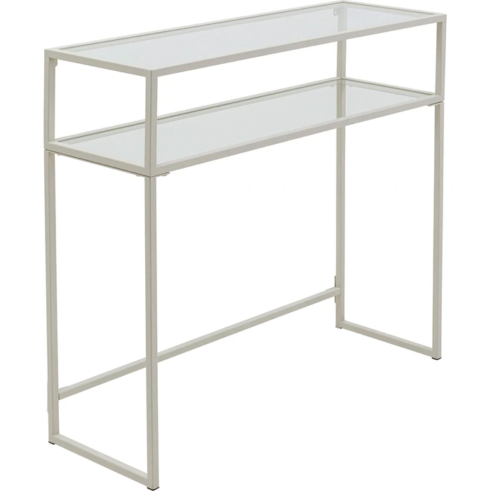 Stilrent konsolbord i greige stål och glas med två hyllplan.