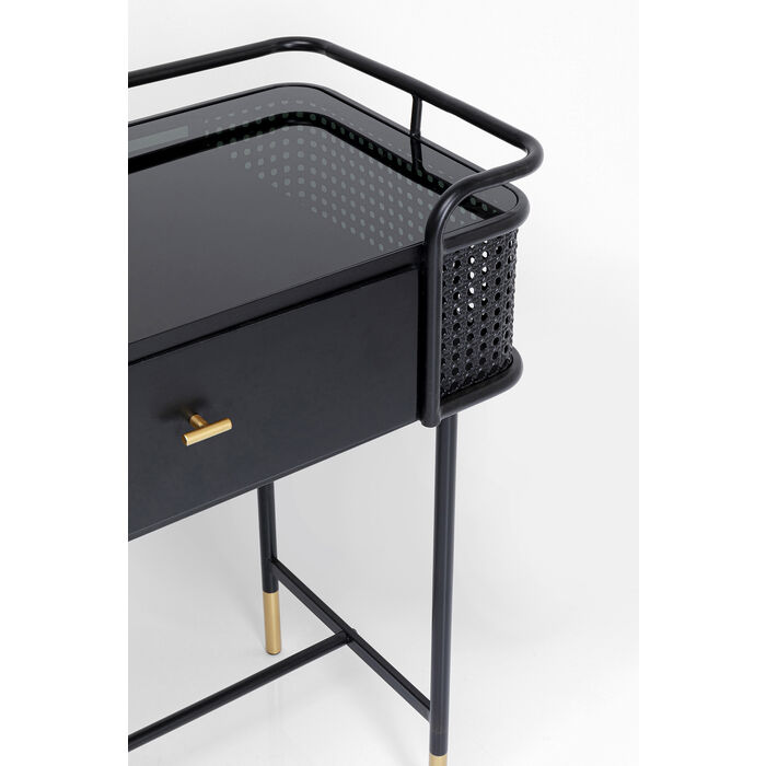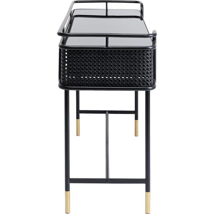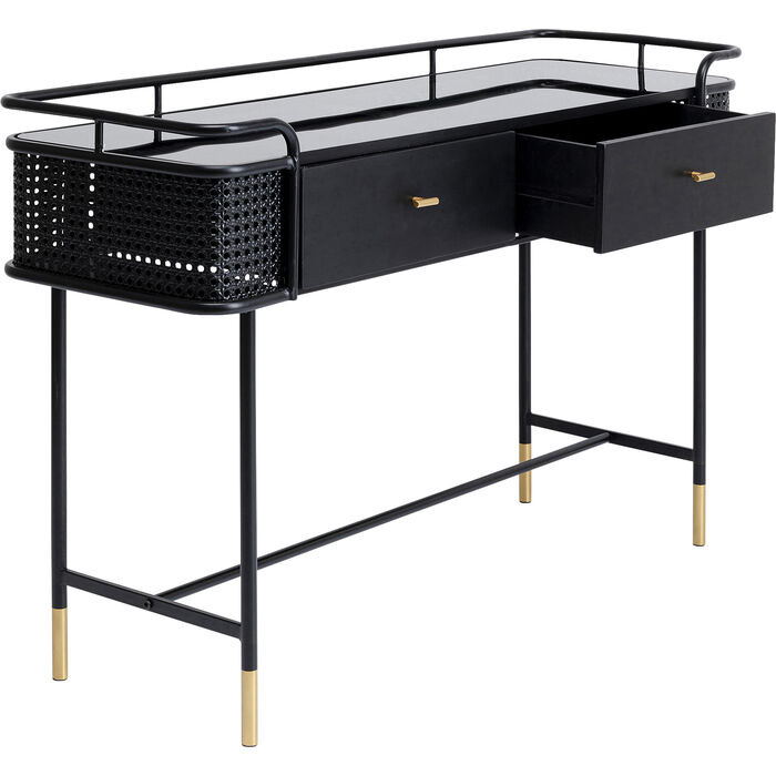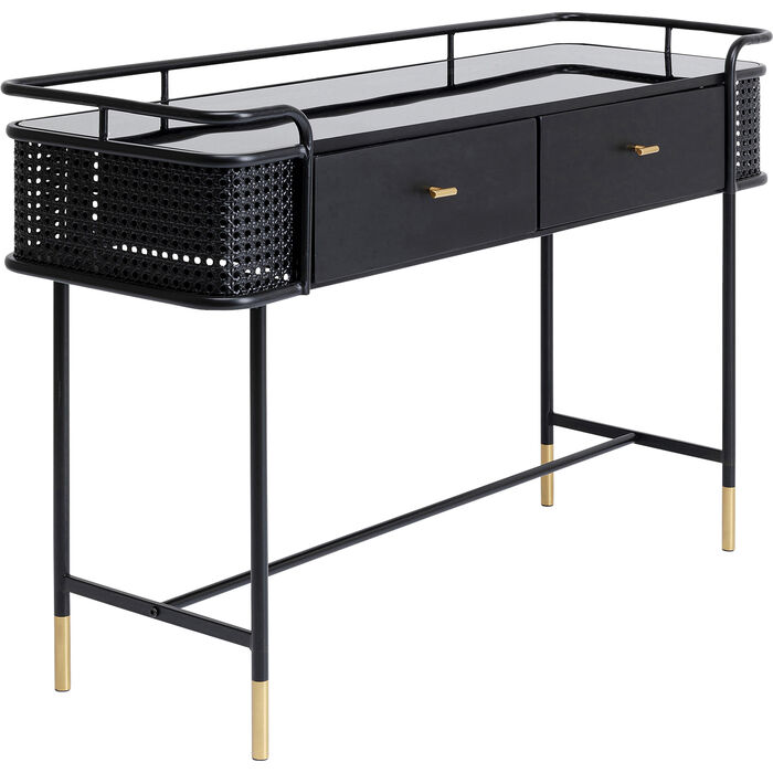 - Konsolbord i svart stål som mäter 80/120/40 cm (H/B/D).