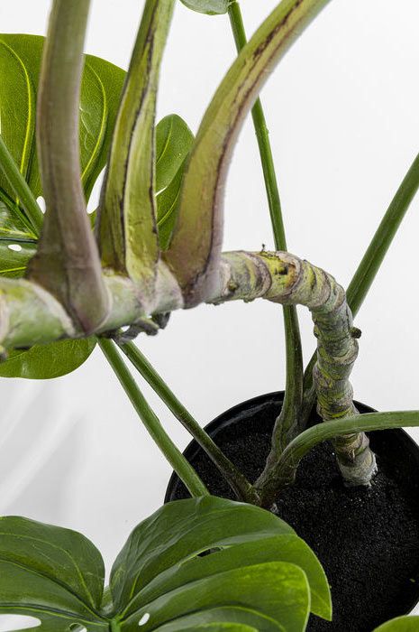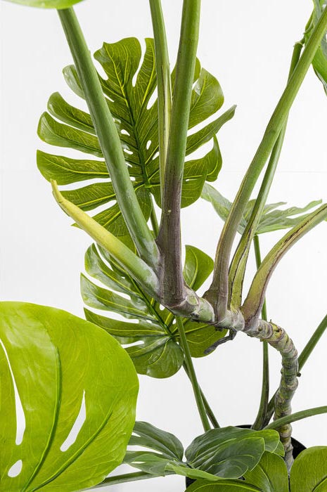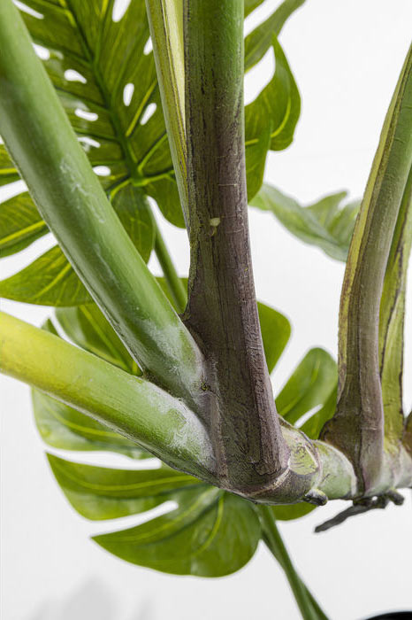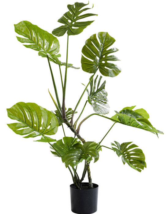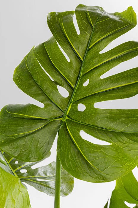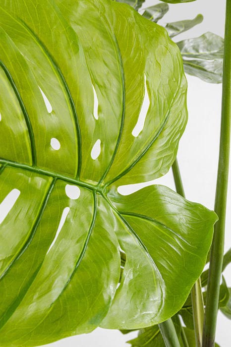 Monstera krukväxt 110 cm hög. Vacker och välgjord konstväxt står grön och fin året om och kräver varken solljus eller skötsel. Perfekt för dig som saknar gröna fingrar, ofta är på resande fot eller vill ha växter även i mörkare rum. Plantan är placerad i en kruka fylld med betong för att Monsteran ska stå stadigt.