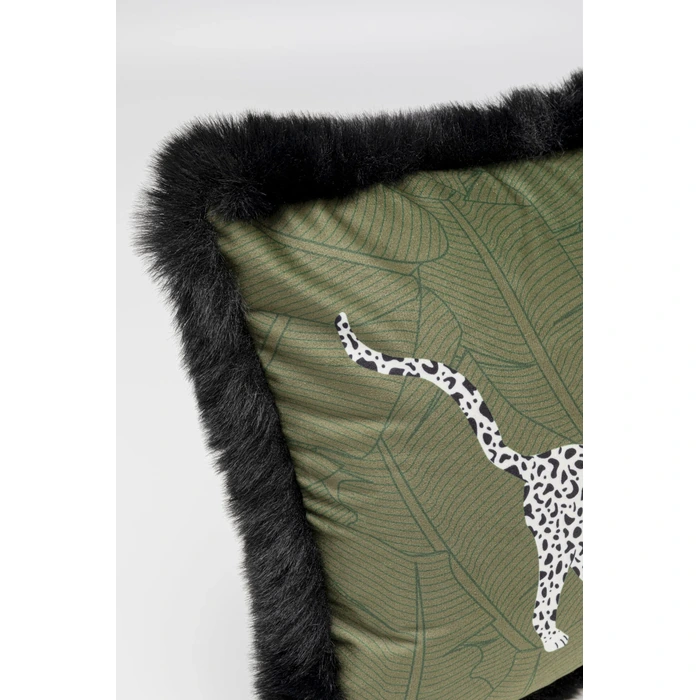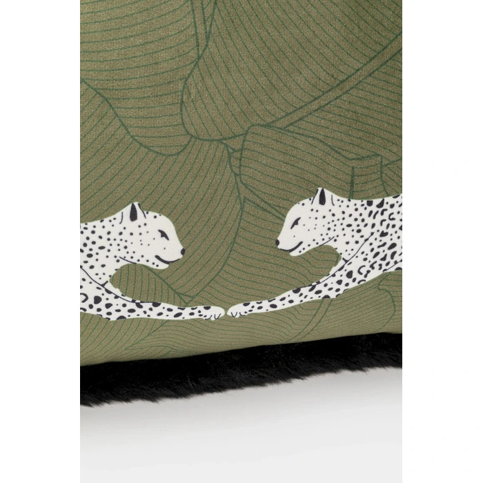 Dekorativ kudde med exotiskt leopardmotiv i gröna toner.