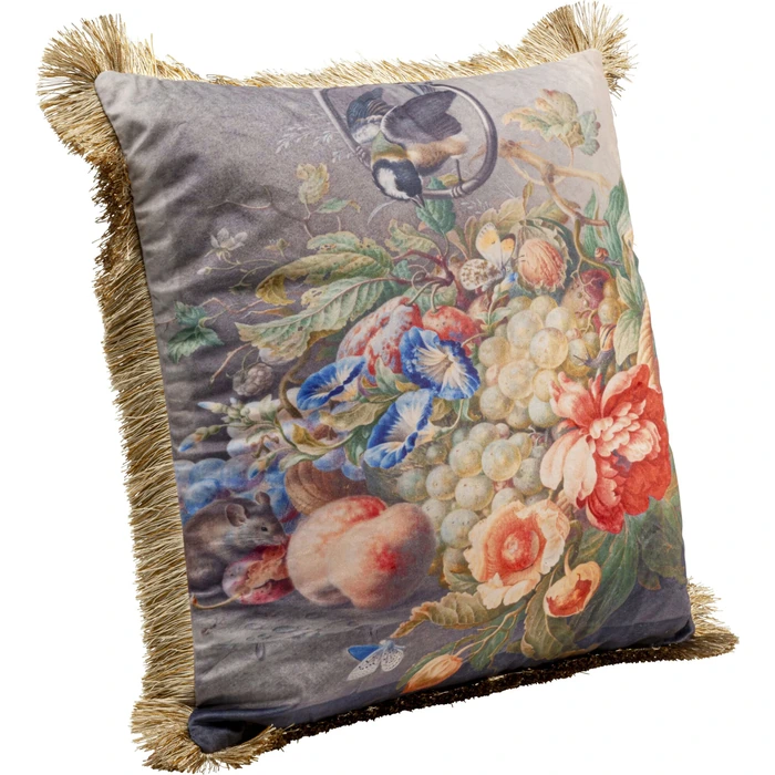 Dekorativ kudde med romantiskt stillebenmotiv i mjuka, dova toner.
