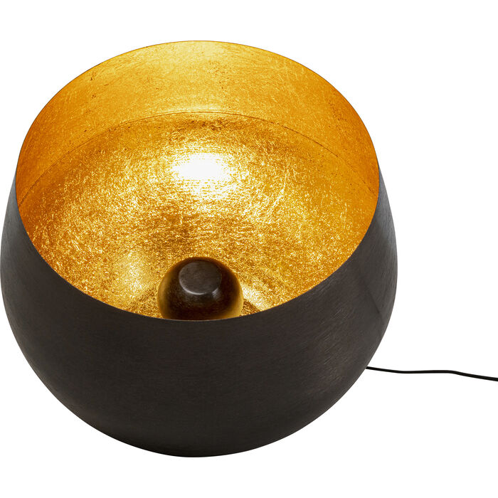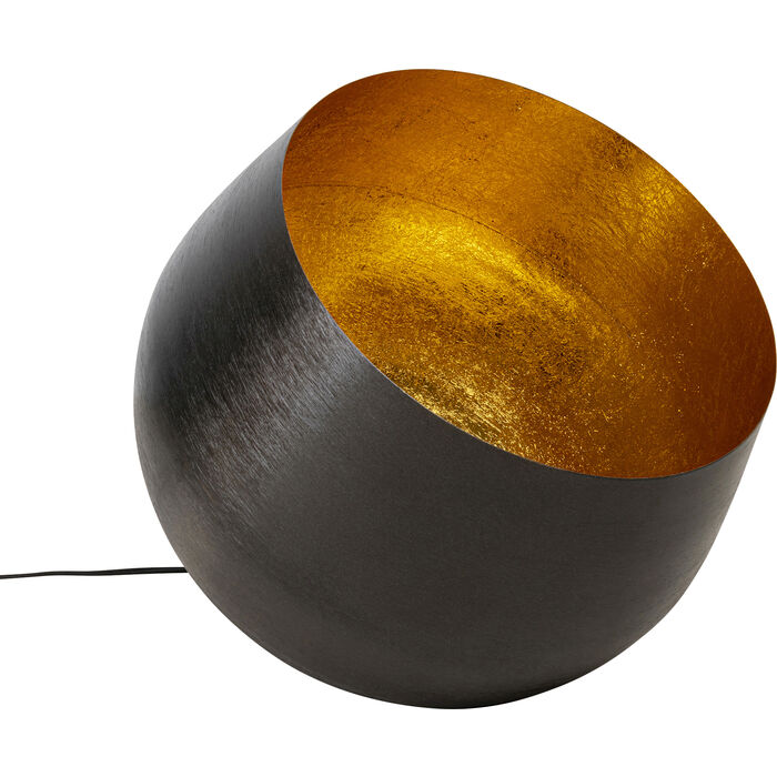 En antracitgrå armatur med en gyllene insida som står ledigt på bordet eller på golvet.