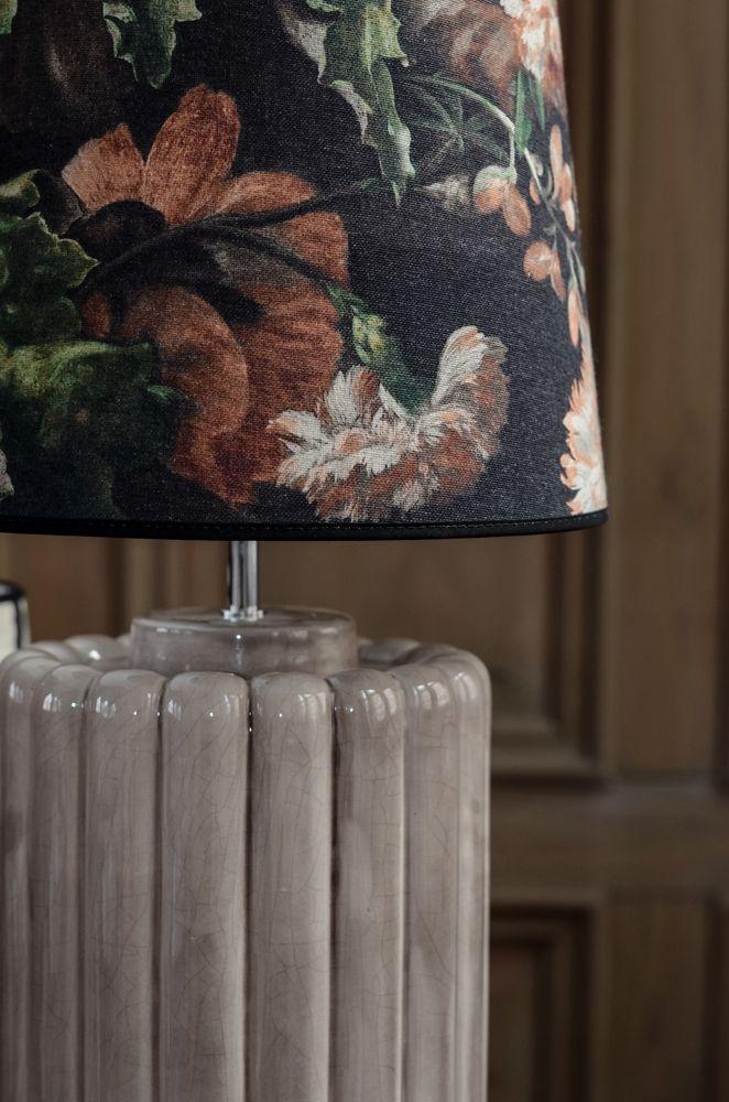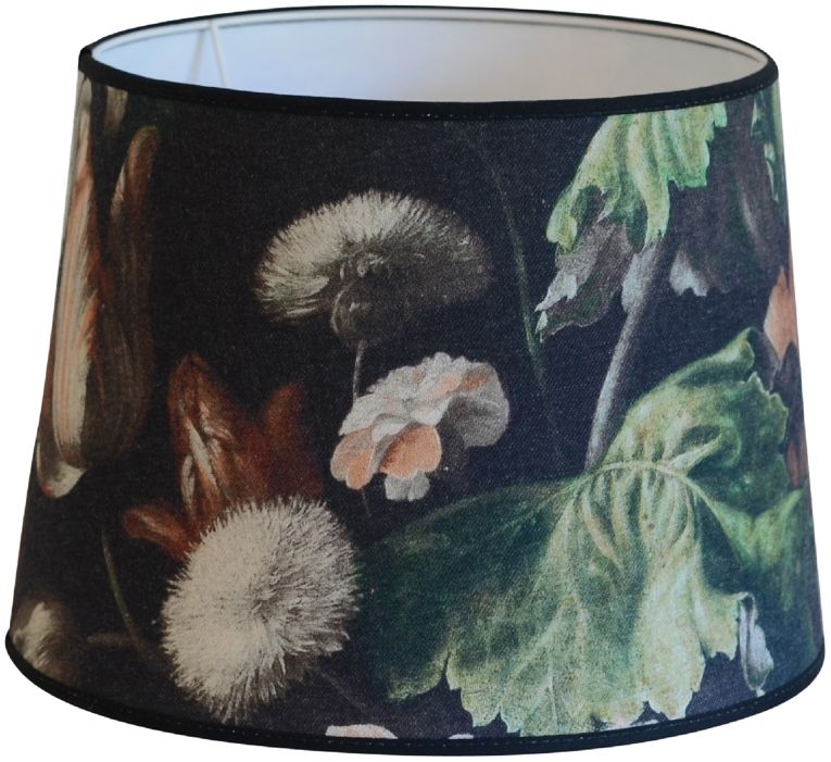Ännu en mycket fin lampskärm från Hallbergs, denna med ett blommor i vackert dova färger på svart botten. Lampskärmen passar en större bordslampa eller golvlampa - lätt att matcha i en modern och lantlig inredningsstil då den är både tuff och romantisk beroende på vilken lampfot man väljer. Vit insida med ringfäste. Material: bomull, stål. Mått: höjd 25 x nedre diameter 35 och övre diameter 30 cm. Vi hjälper dig gärna med förslag på lampfot som passar storleken.