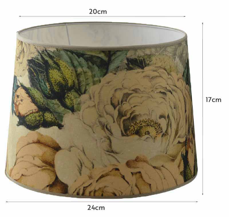 Förnya dina lampor med en ny lampskärm! Denna fina lampskärm med ljusgul och beige färgton är klädd med ett bedårande fång stora rosor med textildesign av John Derian för Designers Guild. Lampskärmen passar både den klassiska och moderna lampfoten. Skärmen är av hög kvalitet från Hallbergs Lighting. Material: Linne. Mått: Diameter nertill; 24, upptill 20 cm. Höjd 17 cm. Ringfäste.