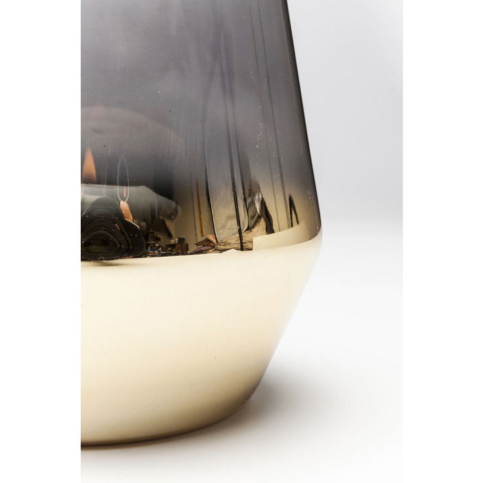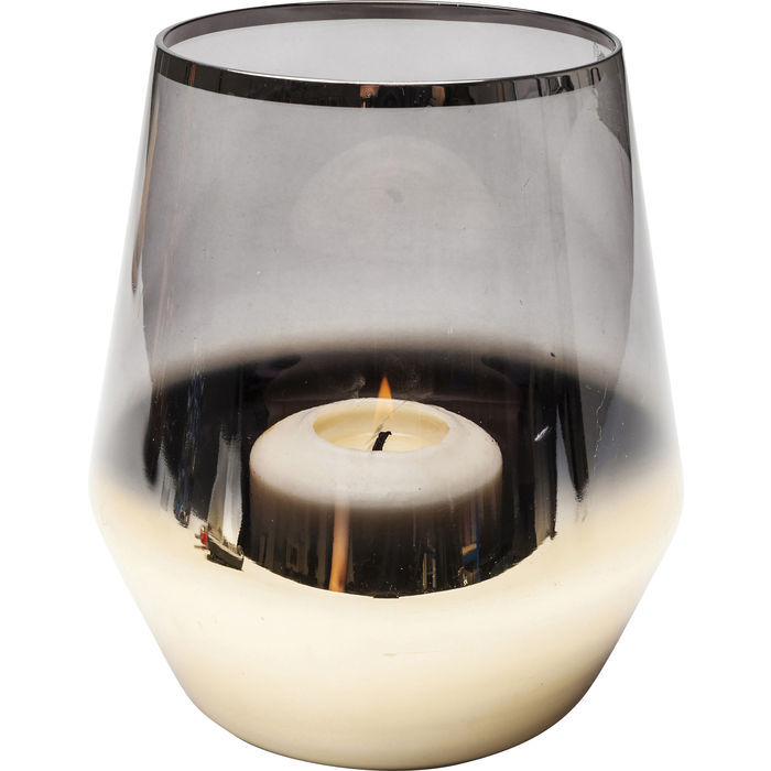 Det här är en favorit bland våra ljuslyktor - stilren form och fin mix av tonat dimgrått glas och guld. Tillverkat i lackat glas. Mått: höjd 20,5 x 18 cm i diameter.