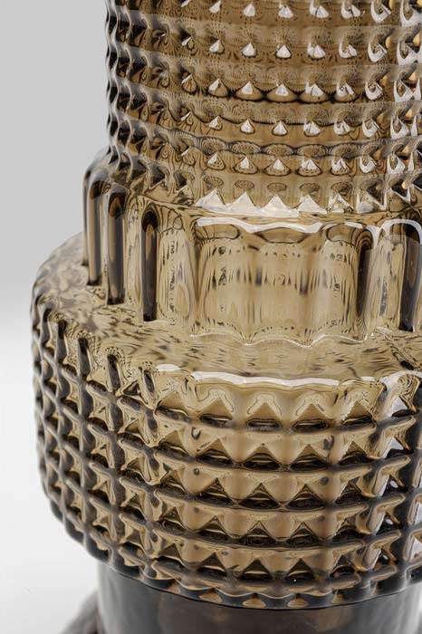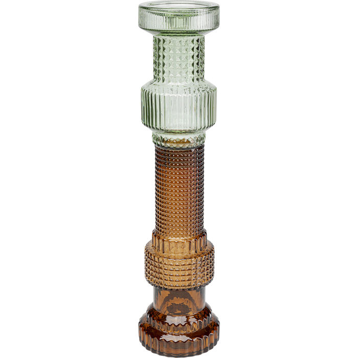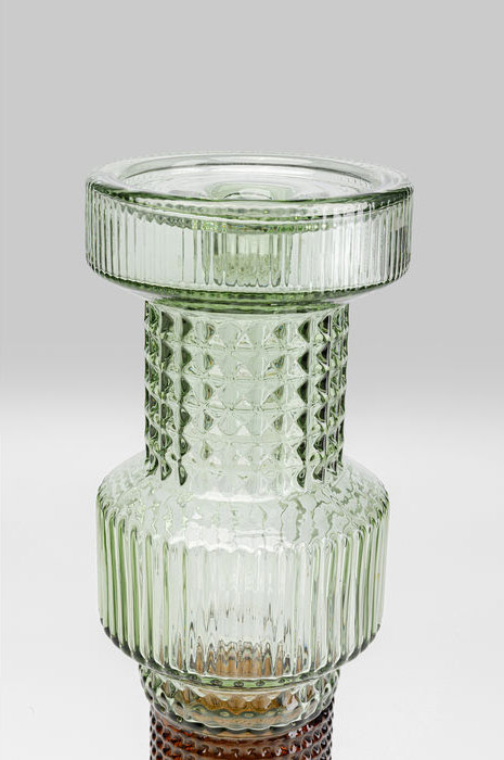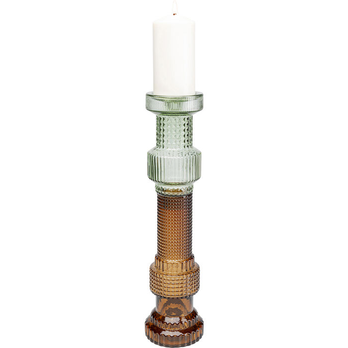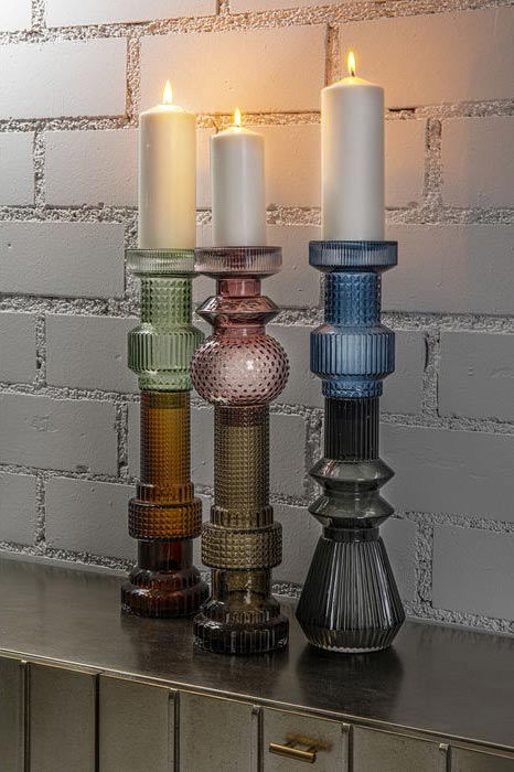 En hög ljusstake i tvåfärgat glas, avsedd för blockljus men även urtag för kronljus. Ljusstaken finns i flera varianter, alla med intressanta geometriska former och reliefstruktur i tvåfärgat glas. Ljusstakarna har en retromodern form och färgerna känns helt rätt för 20-talets inredningsstilar.
