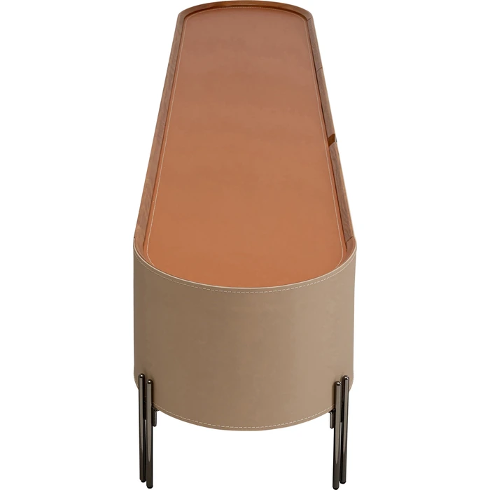 Lowboard Tango kombinerar mjuka beige- och orangetoner med en elegant klädsel i läderlook. De ljusa kontrastsömmarna ramar in möbeln och ger ett genomarbetat uttryck, medan de nätta stålbenen skapar en luftig känsla som passar lika bra i vardagsrum som i hall.