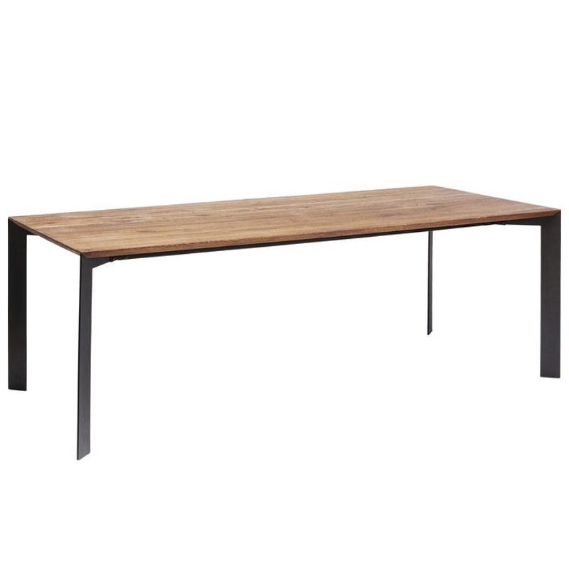 Ett stort modernt matbord i massiv ek som ger plats för upp till 8 personer. Bordet är gediget med rustik bordsskiva i mörk oljad ek och stadigt underrede med vinklade ben i svart pulverlacket stål. I serien finns även soffbord, sidobord och skåp | skänk. Material: massiv oljad ek, stål. Mått: höjd 77 x längd 220 x bredd 100 cm. Vikt: 88 kg. Benen monteras.