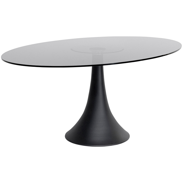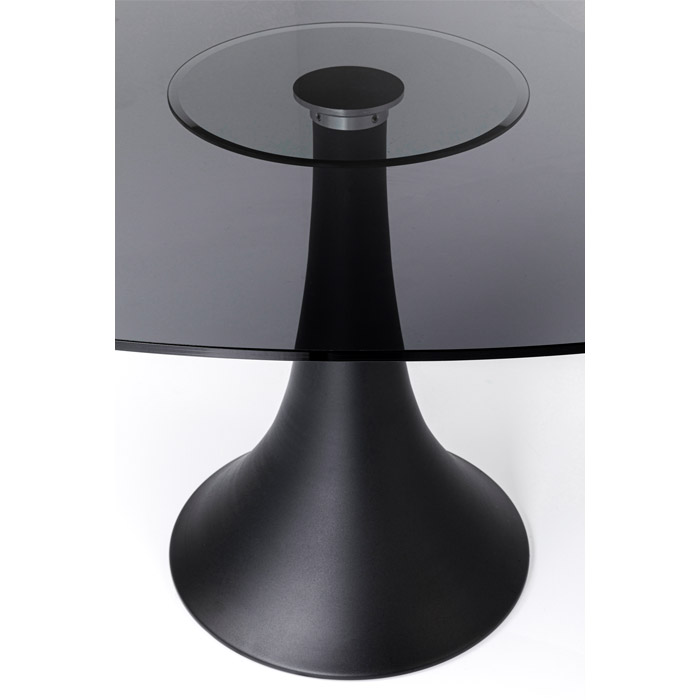 Ett modernt matbord med oval glasskiva och bordsunderrede i trumpetform som ger bekväm plats för ben och stolar. En tidlös möbel som du kan dekorera på flera sätt och använda i olika rum. Tack vare sin design kan den kombineras med olika stilar och sittmöbler. Snyggt tillsammans med läder, trä eller i form av vadderade stolar. Ett modernt glasbord för matsalen eller som ett minimalistiskt mötesbord på kontoret med designkänsla. Det ovala, svarta glasbordet är också okomplicerat när det kommer till dukar, servis och glas.