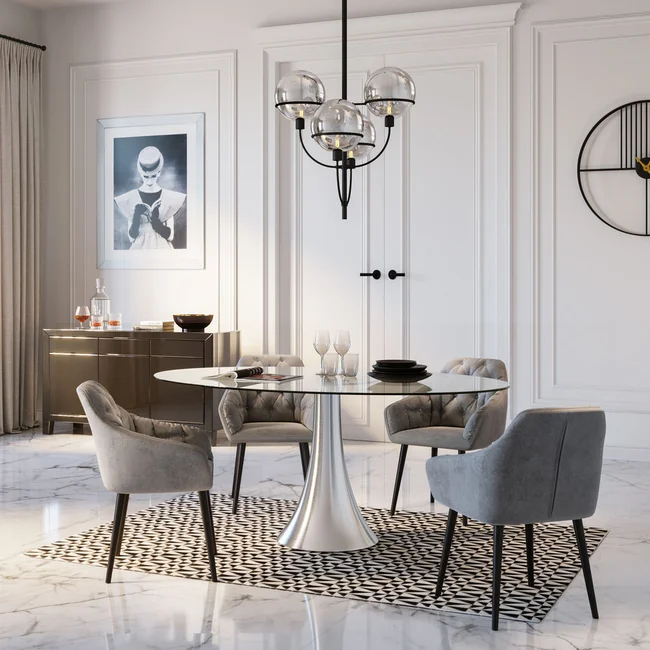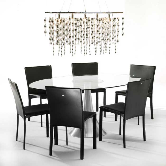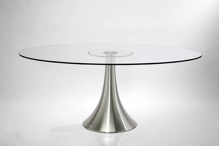 Ett modernt matbord med oval glasskiva och bordsunderrede i trumpetform som ger bekväm plast för ben och stolar. Matbordet ger plats för 6-8 personer. Glasskivan är i härdat glas, 10 mm och bordsunderredet i borstad aluminium.