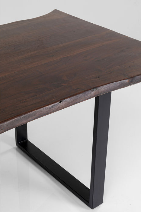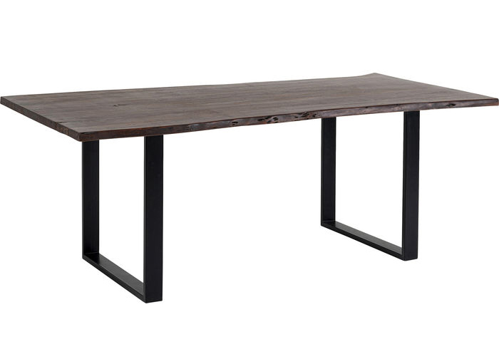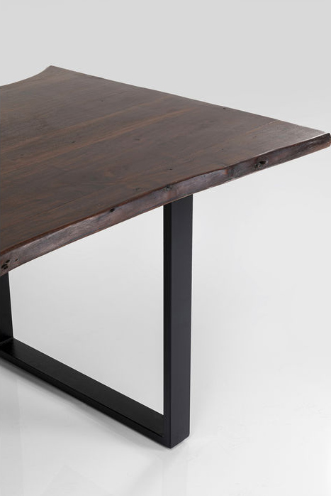 Ett modernt matbord med rustik bordsskiva i massivt mörkt trä och med en naturligt ojämn kant som ger bordet en lantlig karaktär. Det strama svarta underredet i u-form är ett stilrent komplement till den grova bordsskivan. Borden i den här serien kommer i många varianter där du kan välja trätyp, färg, rak eller ojämn kan samt underreden i olika färger. Bordet ger plats för 6 personer. Ett kvalitetsbord som håller över tid.