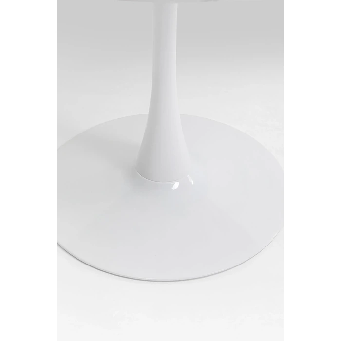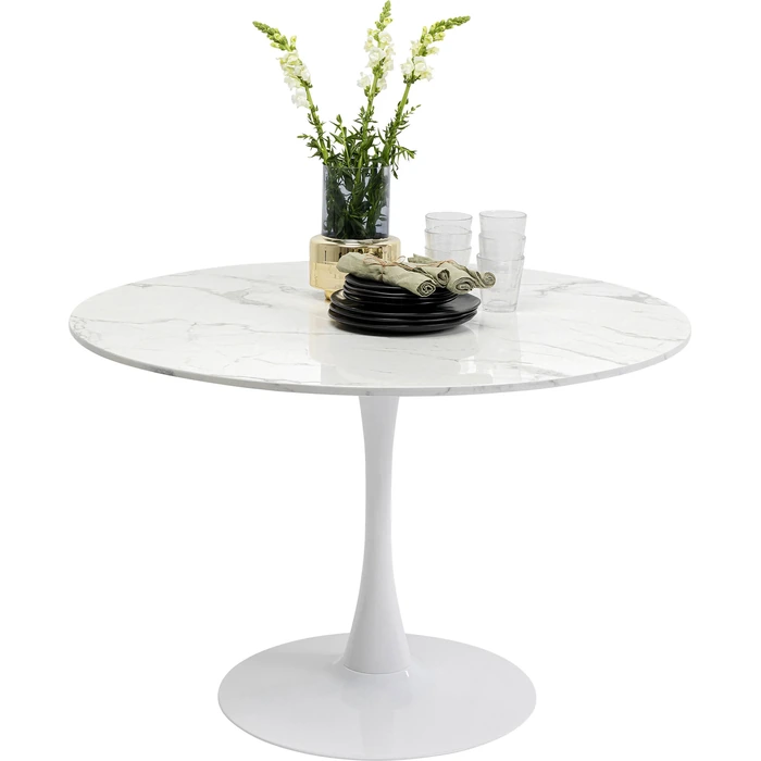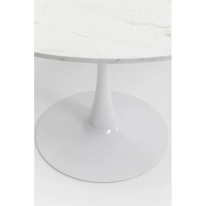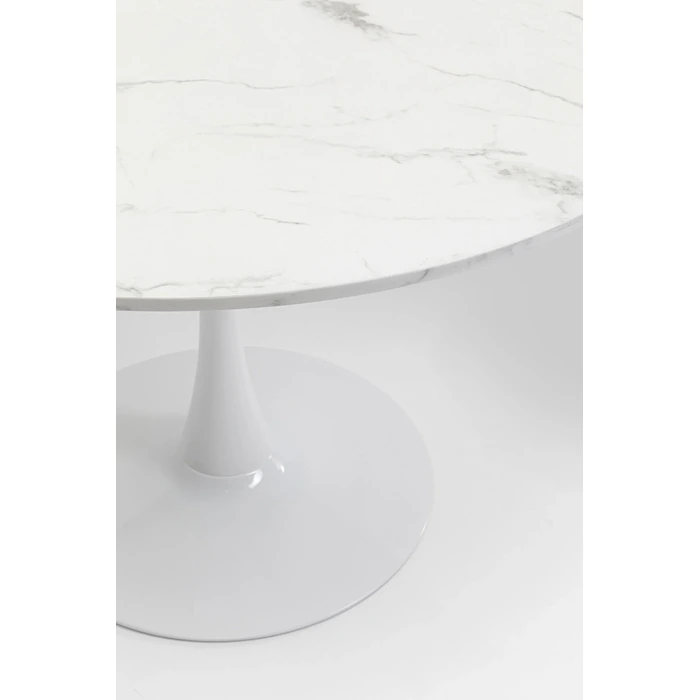 Runt matbord i vit marmorlook med tulpanformad bas för 4–6 personer.