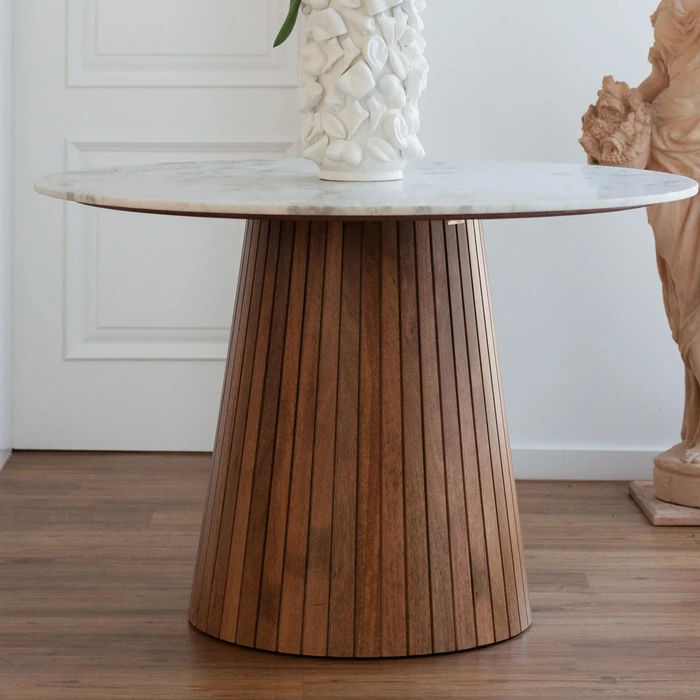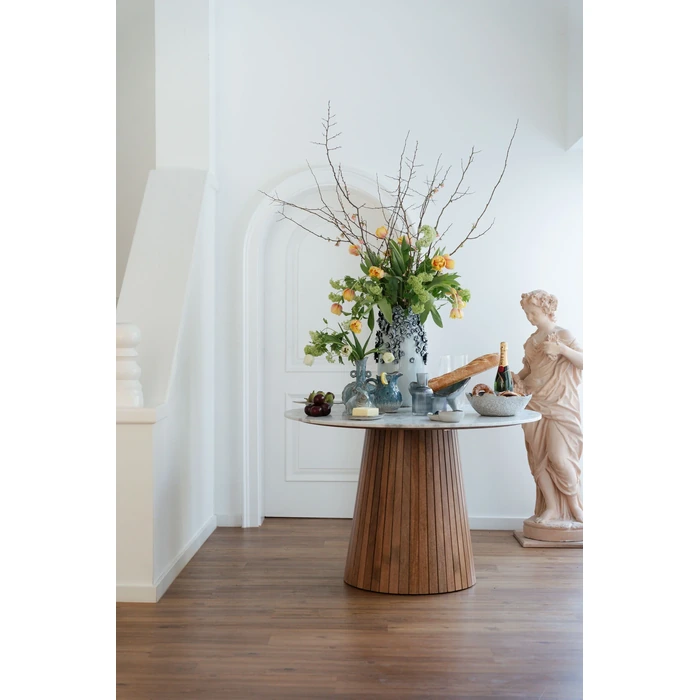 Elegant runt matbord där vit marmor möter varm mangoträ i en stabil mittfot med räfflad struktur. Den generösa diametern på 115 cm ger gott om plats för 3–4 sittplatser och skapar en inbjudande samlingspunkt.