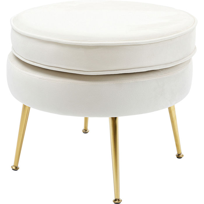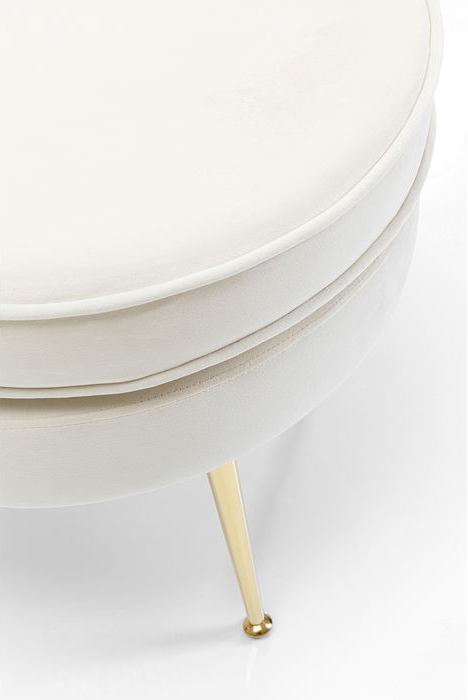 En smäcker och elegant pall i cremevit sammet med rund dyna dekorerad med passpoal. Nätta ben i mässingsfinish. Pallen är ett perfekt komplement till möbleringen - som extra sittplats och skön fotpall i vardagsrummet eller lyxig detalj till sovrummet eller ditt dressingroom. Fin tillsammans med Fåtölj Lilja, Vit.
