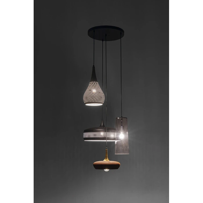 Pendel Melange är en uttrycksfull taklampa som kombinerar fyra olika lampskärmar i glas och stål till ett levande och dynamiskt designobjekt. Blandningen av skimrande och matta ytor skapar djup och karaktär och gör lampan till ett tydligt blickfång i rummet.