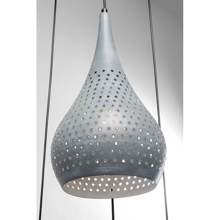 Konstnärlig pendellampa med fyra skärmar i varierade former och ytor.