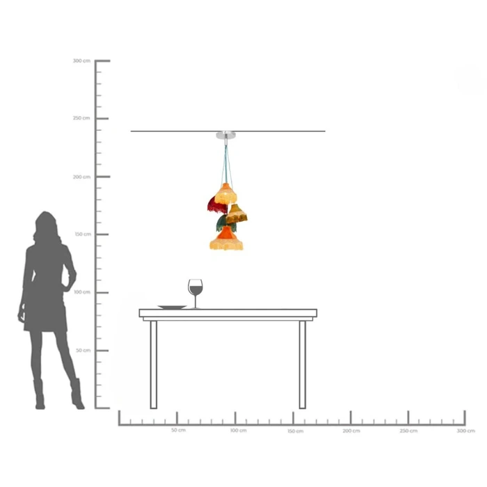 Pendel Saloon Fringes är en uttrycksfull taklampa som kombinerar nostalgisk charm med sofistikerad design. De fem individuellt utformade lampskärmarna med dekorativa fransar och mjuka textilier skapar ett varmt och inbjudande ljus som ger rummet karaktär.