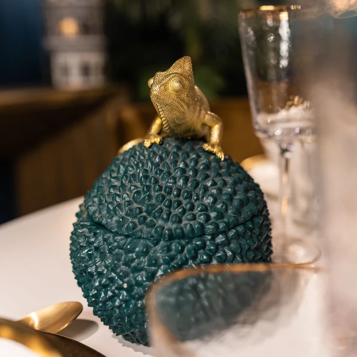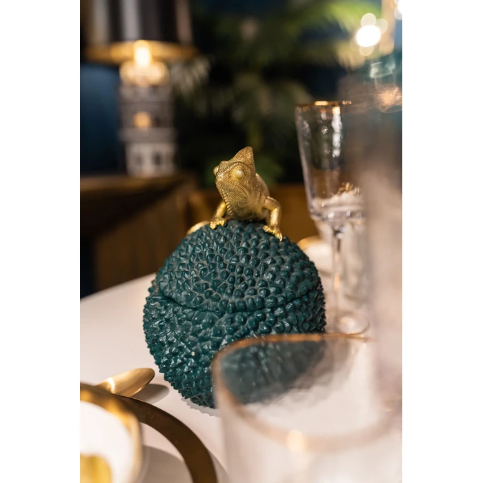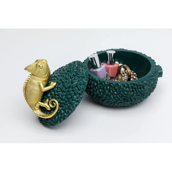 Dekorativ ask i grönt med guldfärgad kameleont – liten förvaring som sätter karaktär i rummet.