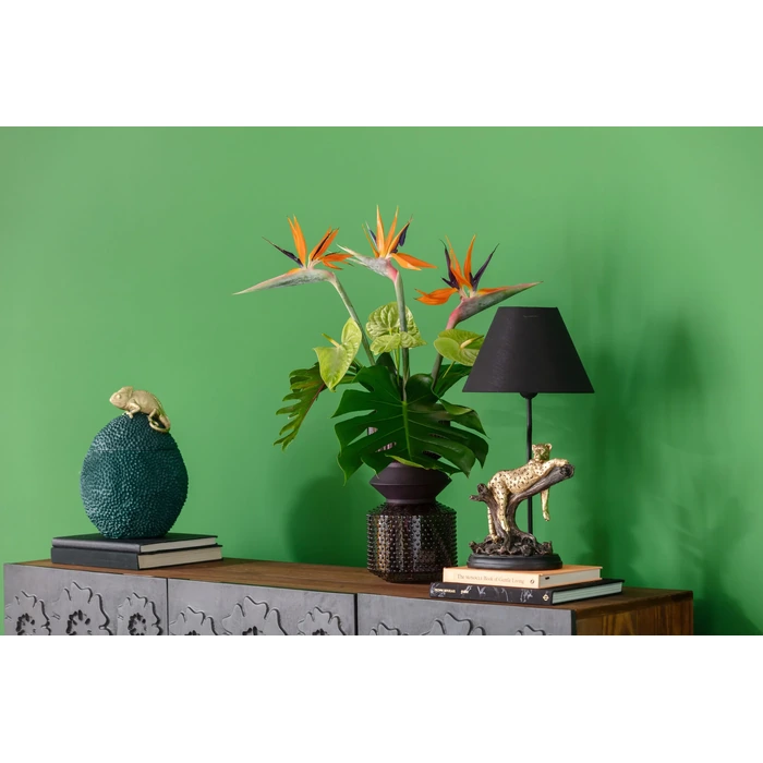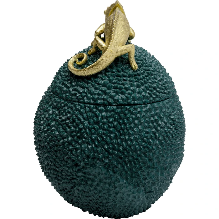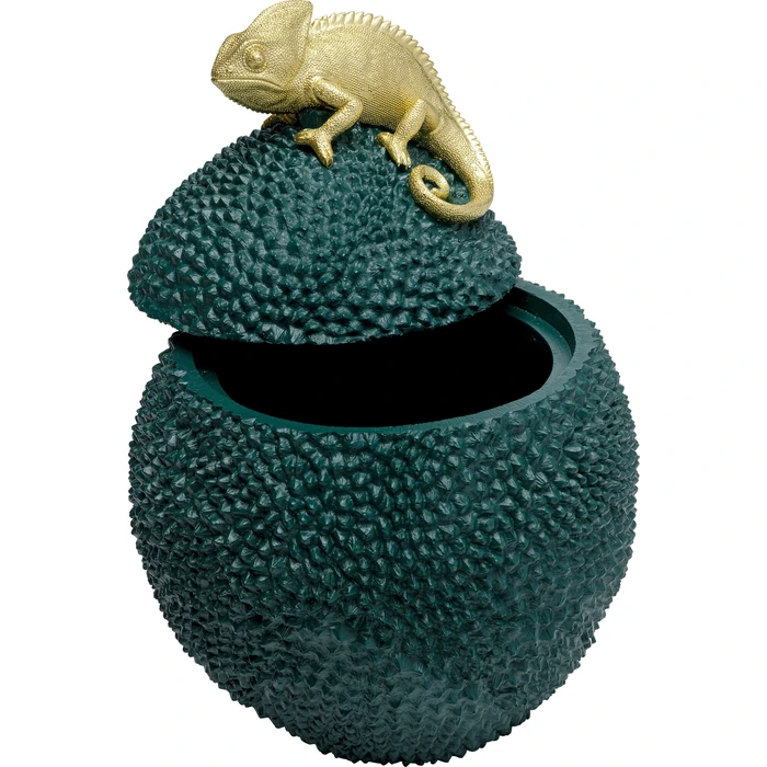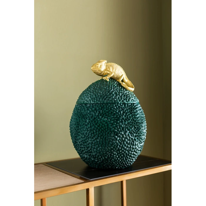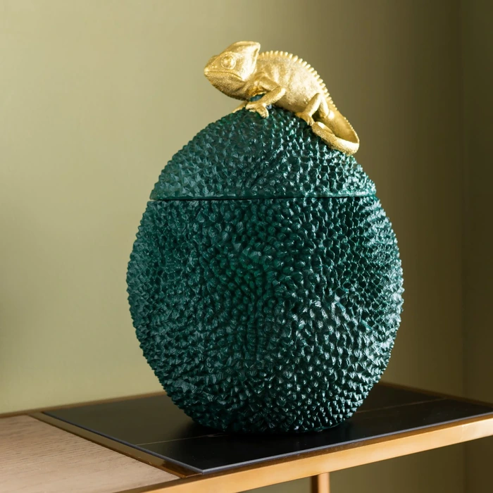 Stor prydnadsask i grönt med guldfärgad kameleont – blickfång som även döljer smått och gott.