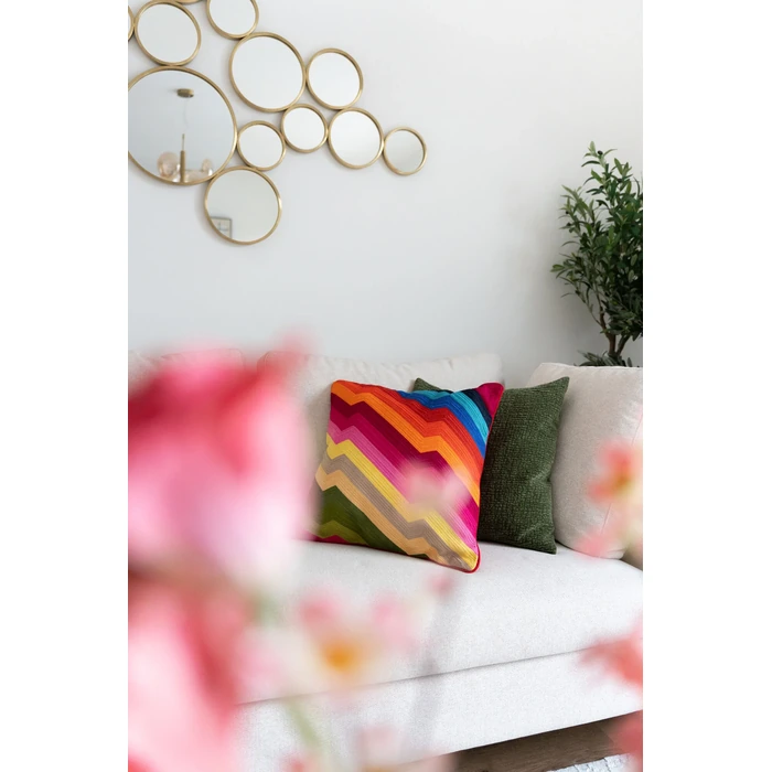 Färgstark stil möter mjuk komfort! Denna konstfullt mönstrade prydnadskudde blir ett verkligt designstatement i hemmet med sina livfulla nyanser och abstrakta former. Blandningen av ull och bomull ger en behaglig känsla och inbjuder till avkoppling. Oavsett om den placeras som blickfång i soffan, som accent i fåtöljen eller som färgklick i sängen, harmonierar kudden perfekt med moderna sammetssoffor, skandinaviska trämöbler eller boho-inspirerad inredning. Den skapar levande kontraster mot enfärgade ytor och tillför både värme och karaktär till rummet.
