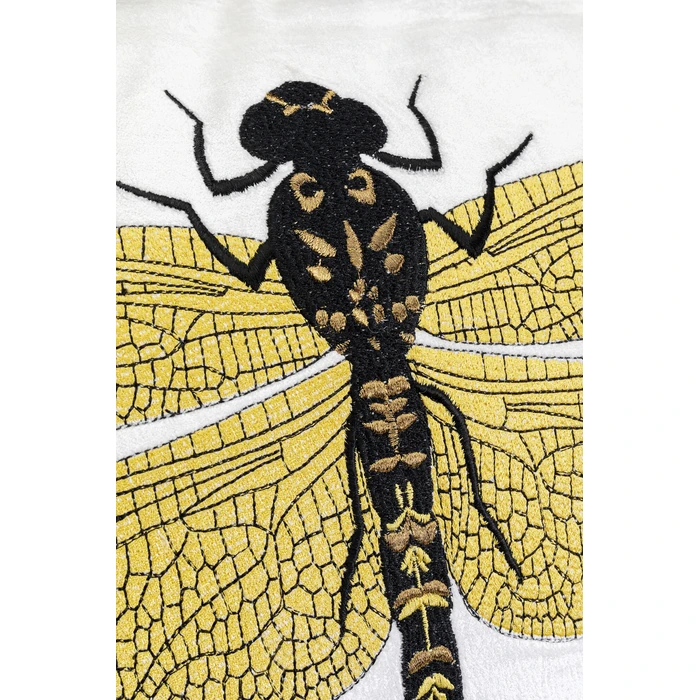 Den rikt broderade trollsländan i guldtoner skapar ett iögonfallande blickfång, medan den dekorativa kantsömmen ger en elegant inramning. Kudden passar perfekt i vardagsrum, sovrum eller loungeytor och gör sig särskilt vacker tillsammans med ljusa textilier, sammet eller metalliska accenter.