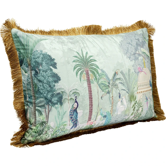Rektangulär kudde i mjuk sammet med frans och tropiskt motiv. Fodral med dragkedja och innerkudde ingår.