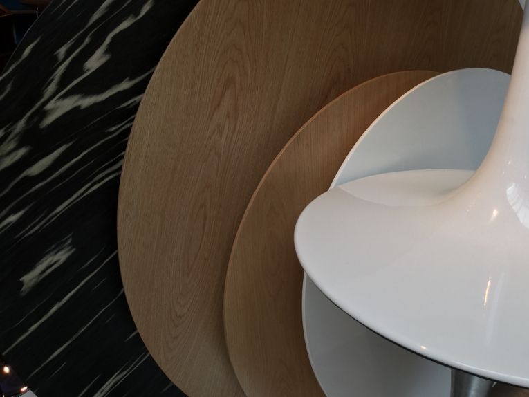 Designa ditt runda matbord med våra bordsunderreden i trumpetfotsmodell och runda bordskivor i serien Choice. Denna bordskiva har ett ytskikt i oljad ekfanér. Som matbord sitter man bekvämt 5 och max 6 personer kring bordet.