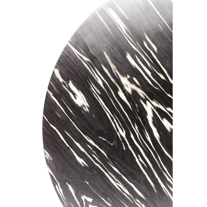 En rund bordsskiva i svart marmorerad struktur av ebenholtsfaner som du kan köpa fristående till ett eget bordsunderrede eller i kombination med våra underreden i trumpetfotsmodell som finns i flera färger. Material: mdf, fanér 2,5 mm. Diameter 90 cm. Som matbord sitter man bekvämt 3 och max 4 personer. Vikt: 16 kg.