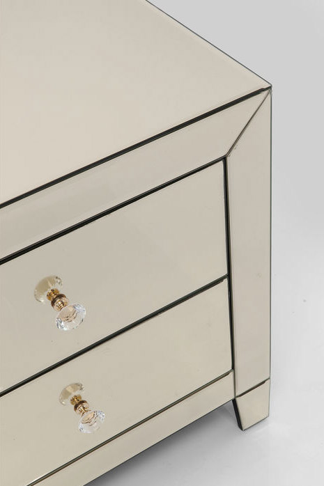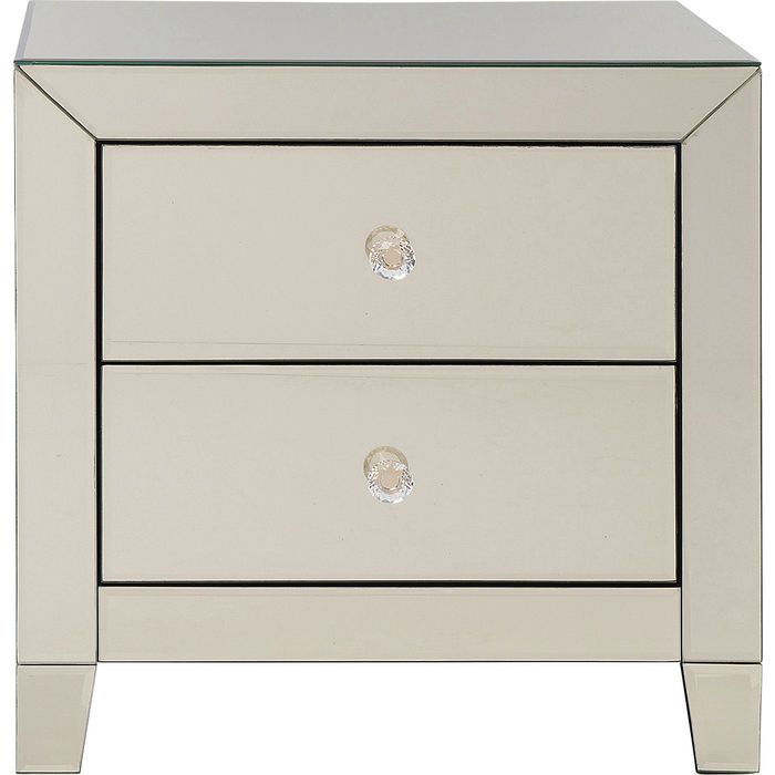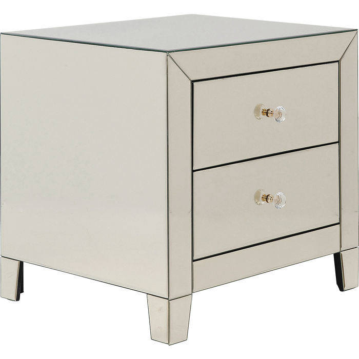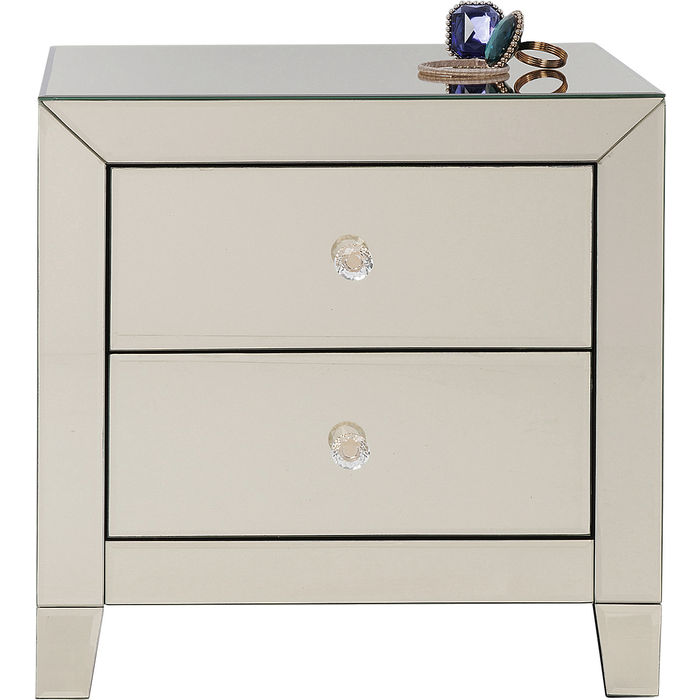 Ett glamoröst sängbord klätt helt i champagnetonat spegelglas. Bordet har två lådor som ger praktisk förvaring både som sängbord och sidobord vid soffan! Mått: Höjd 50 x bredd 49 x djup 41 cm. Vikt: 18 kg. Mått lådor: 12.5x33.5x32.5 cm. Material: Stomme i mdf, ytskikt av tonat spegelglas samt handtag av glas. I serien Spegel finns flera fina förvaringsmöbler och bord.