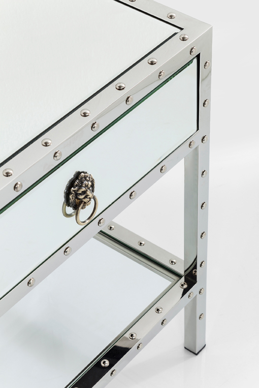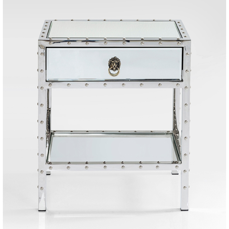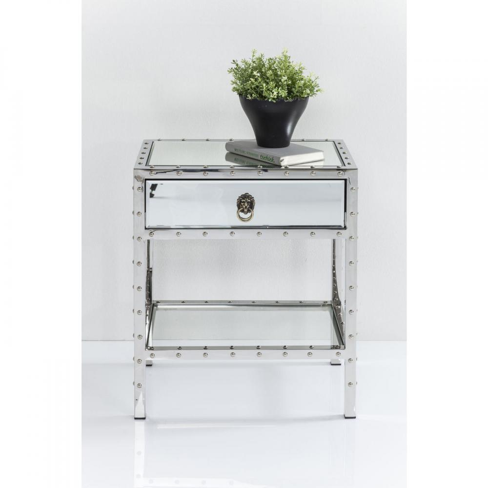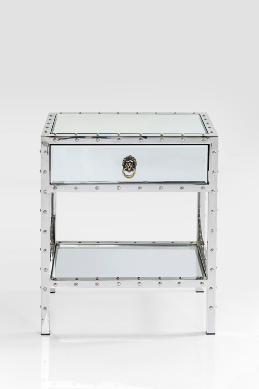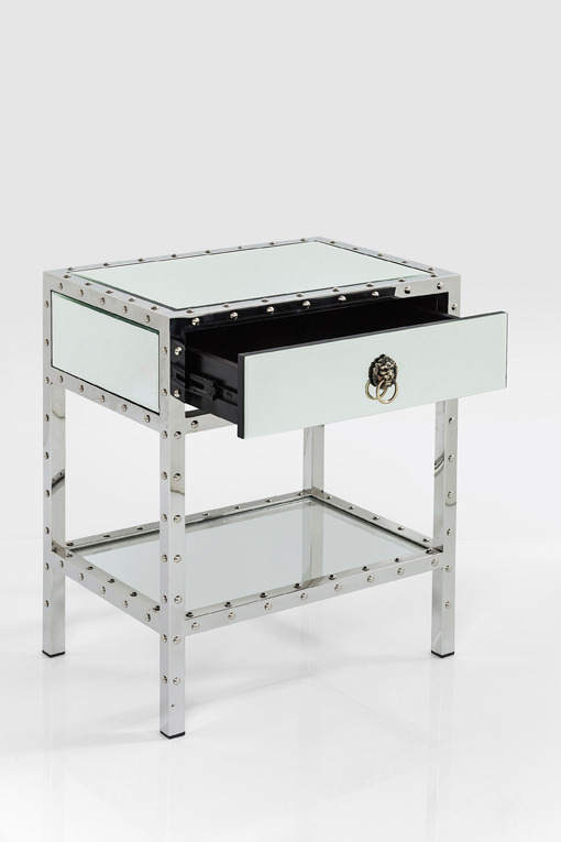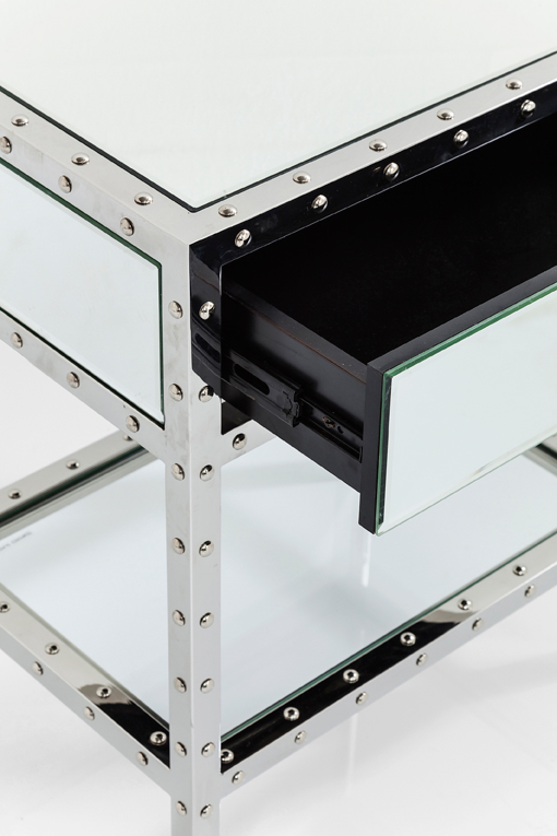 Ett mycket elegant sängbord i spegelglas och kromat stål med dekorativa nitar som fin detalj. Praktisk liten låda samt hylla som ger plats för böcker och magasin.