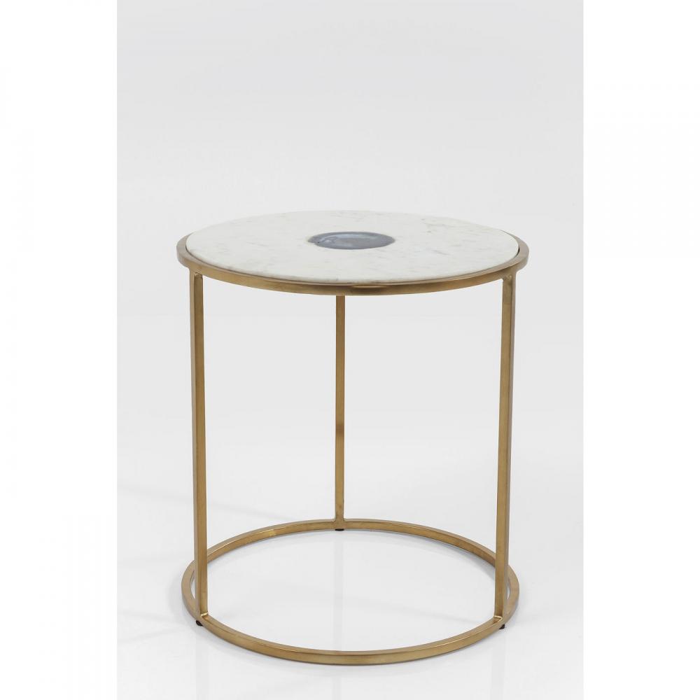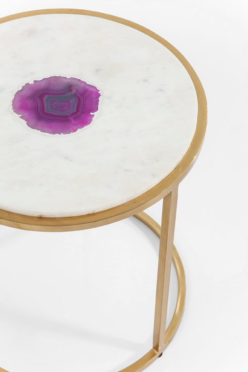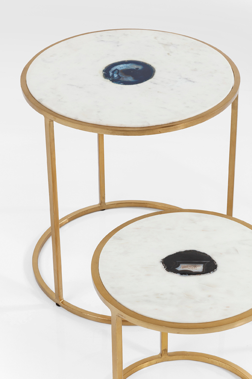 Eleganta runda små satsbord med stilren ram i mässing och ovanligt vackra bordsskivor i vit marmor med inlägg av agat ädelsten - alla med unikt utseende. Passar som soffbord och sidobord. Mått höjd x diameter: Stora 45 x 43 cm, mellan: 40,5 x 37, lilla: 34,5 x 32 cm. Vikt totalt: 16 kg. Max belastning 10 kg. Material: Ram av elektropläterat stål med mässingsfinish. Toppskiva av marmor och agat ädelsten.