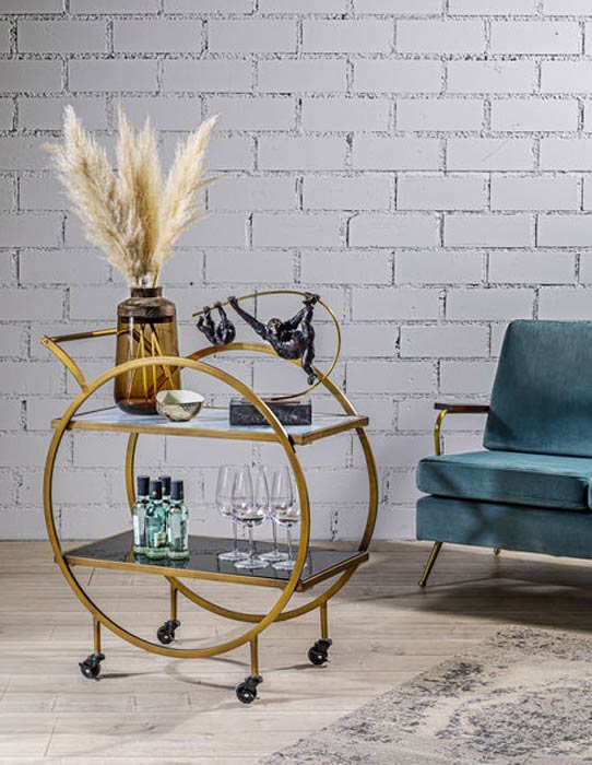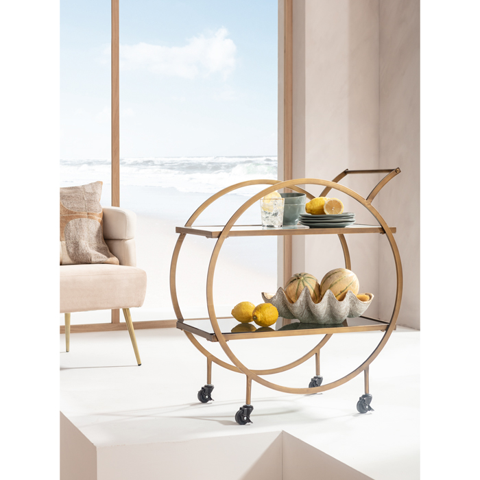 Varje dag är en fest! Det är något underbart glamoröst med en serveringsvagn, som alltid är redo för spontana besök. Formen påminner om Art Déco-design och den antika mässingsfinishen gör att den ser extra elegant ut. Den är dessutom smidig och hjälper till som mobil hylla i köket, sovrummet eller badrummet.