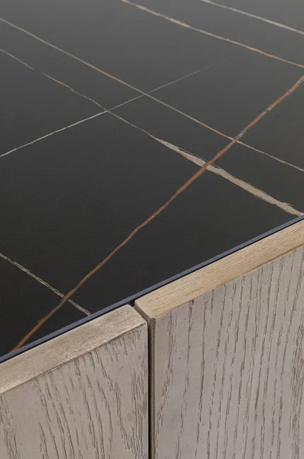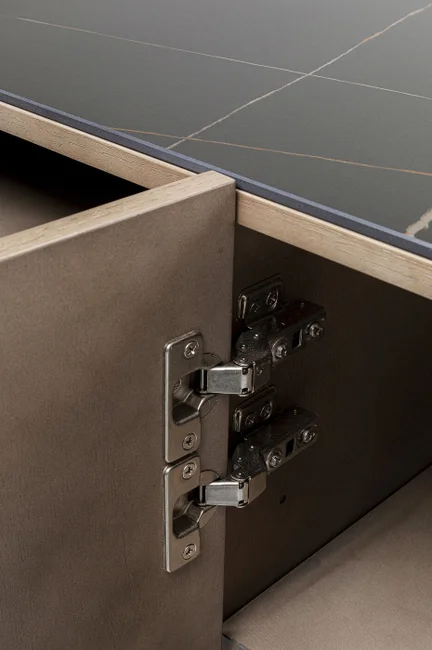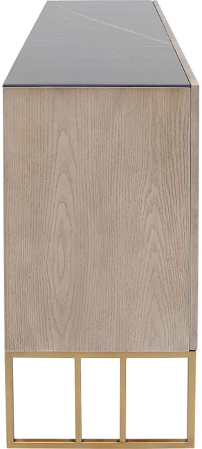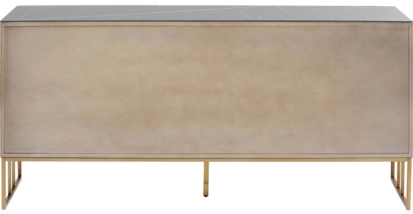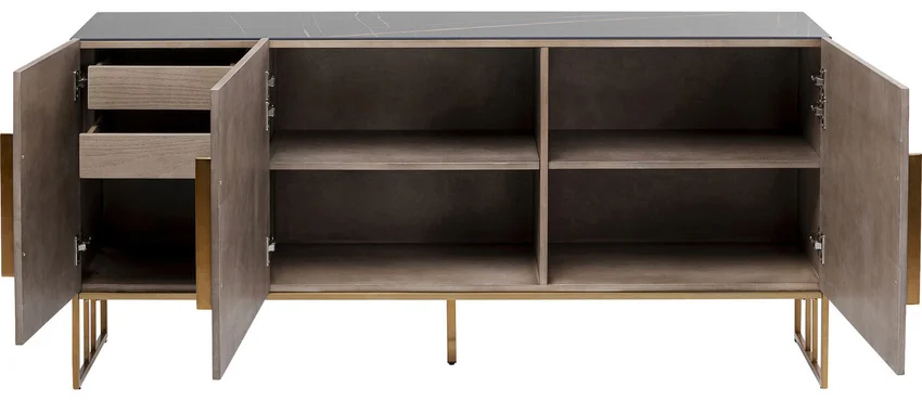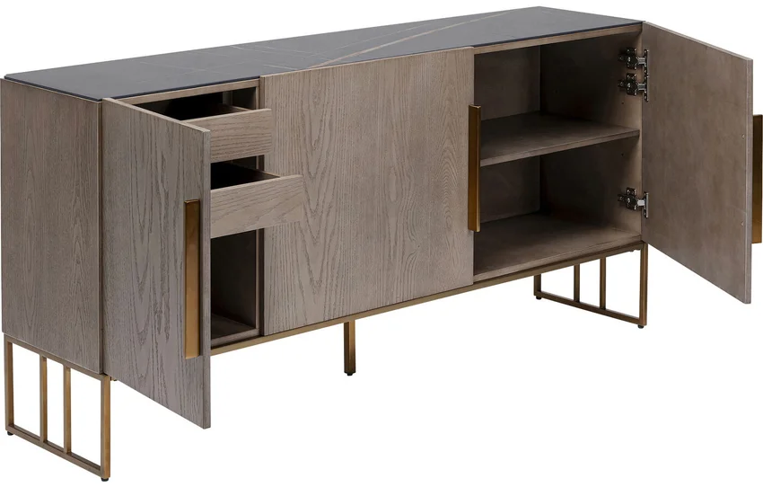 - Skänken har en slående vacker topp gjord av keramik i jordfärger. Handtagen och ramarna är utförda i mässing