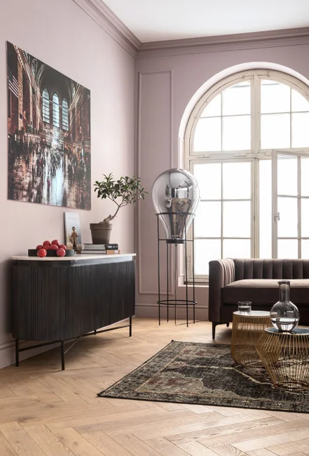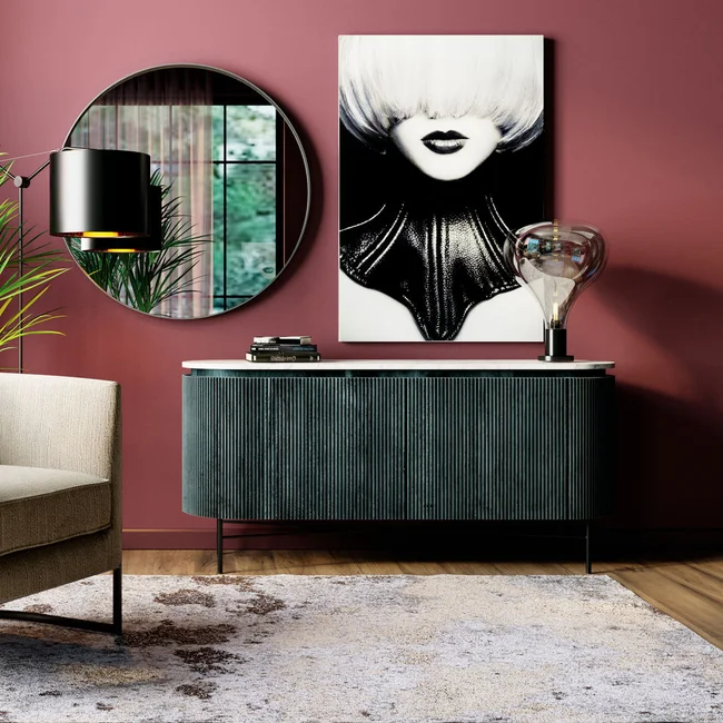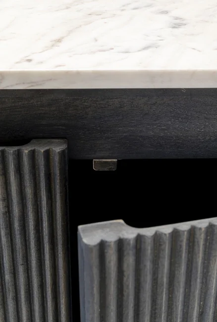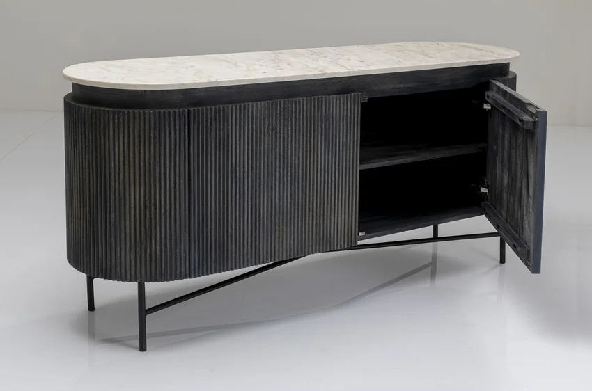 - Leker med den svartvita kontrasten: elegant skänk med ljus marmorskiva, mörkgrå massivträstomme på filigranstålram i svart.