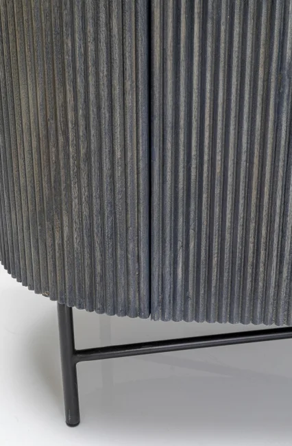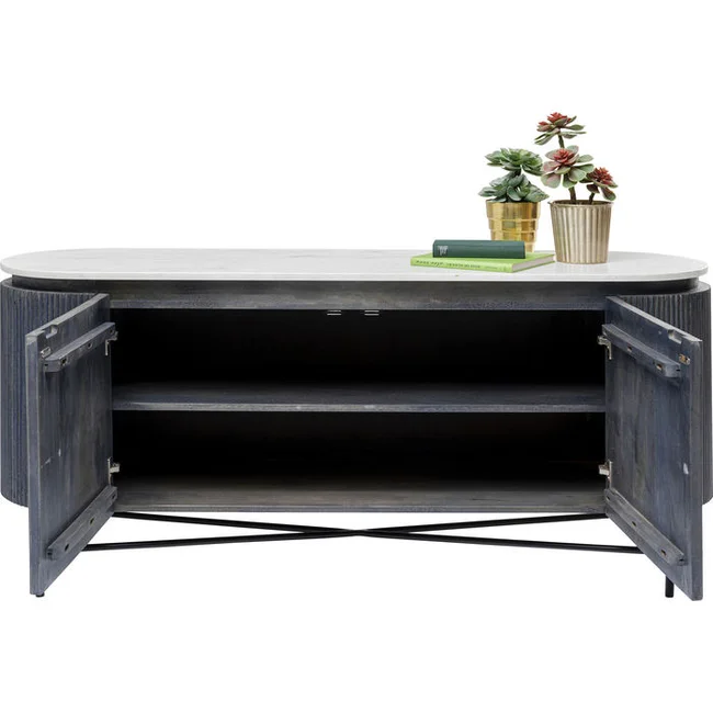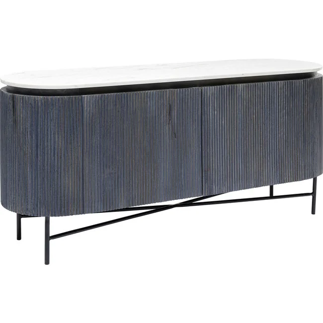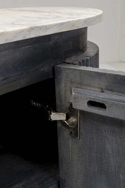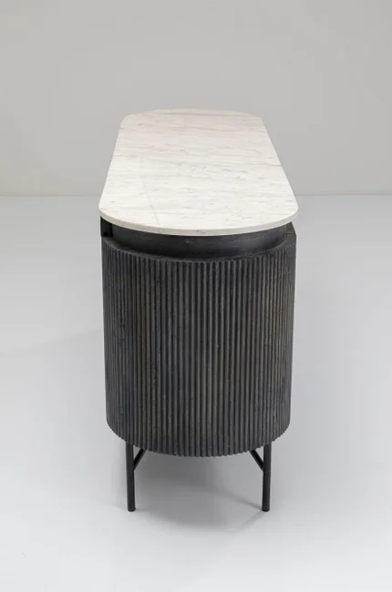 Nobel och unik, enkelt beskrivet. Formen: en platt oval förvaringsyta av äkta marmor i vitt och en kropp som sticker ut bland skänkarna med mörkgrå fronter och sidor av massivt trä i räfflad look. Glenn utstrålar diskret adel och tidlös elegans och övertygar med värdefulla material.